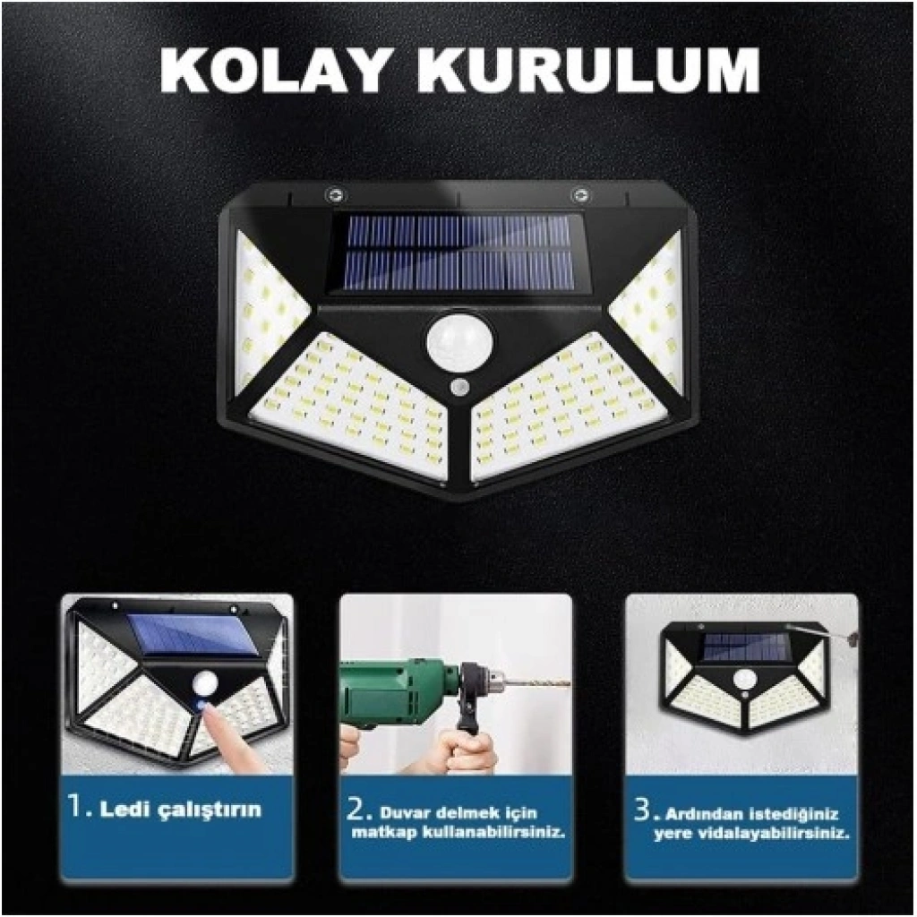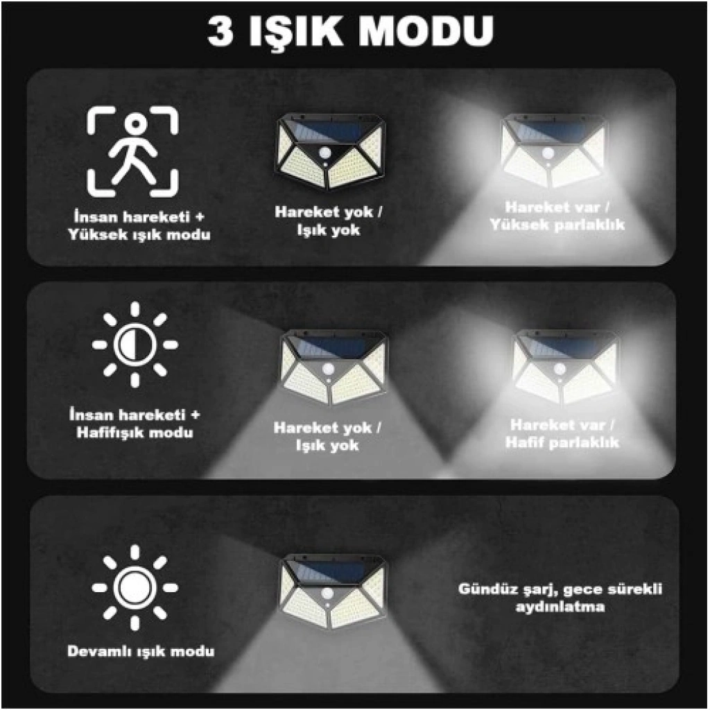 100 ultra parlak LED ile güçlü aydınlatma 8–12 saat güneş şarjı ile uzun süreli kullanım 270° geniş aydınlatma açısı, dört taraflı tasarım 120° hareket algılama aralığı, 3–8 metre sensör mesafesi Hareket algılandığında ışık otomatik olarak devreye girer 3 farklı aydınlatma modu: Mod 1: Sadece hareket algılama Mod 2: Hafif ışık + hareket Mod 3: Sürekli hafif ışık IP65 su geçirmez, dayanıklı ABS malzeme Enerji tasarruflu ve çevre dostu kullanım Gösterge lambalı tasarım Kablosuz montaj, vidalar ile kolay kurulum Önerilen montaj yüksekliği: 1.8 – 4.2 metre Çalışma Prensibi: Güneş paneli gün boyu güneş ışığını toplar ve dahili pili şarj eder. Gece olduğunda ışık otomatik olarak devreye girer. Hareket algılandığında ışık açılır, 30 saniye boyunca başka hareket olmadığında otomatik kapanır. Avantajları: Enerji maliyeti yok – tamamen güneş enerjisi Güçlü güvenlik aydınlatması Dekoratif bahçe ve dış mekan aydınlatması Uzun ömürlü LED ve düşük arıza oranı Akıllı ışık sensörü ile otomatik açma/kapama Bu gelişmiş solar güvenlik lambası, hem dekoratif hem de işlevsel dış mekan aydınlatmaları için ideal bir çözümdür.
