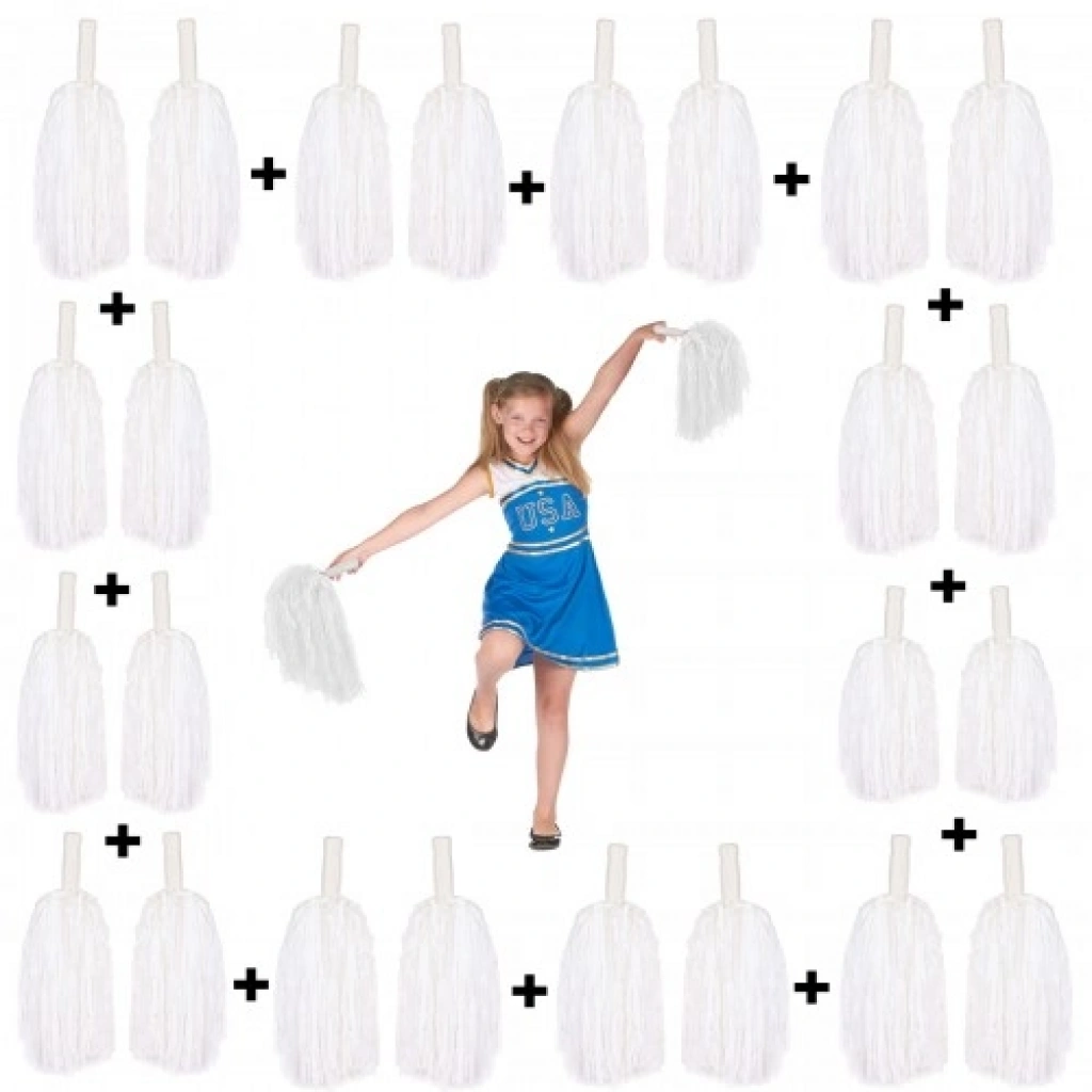 Malzeme: Dayanıklı plastik ipRenk: BeyazAdet: 24 ponpon (12 çift)Boyut: 30 cm uzunluk (tutma yeri dahil)Hafif ve kolay taşınabilirKullanım Alanı: Gösteri, spor etkinlikleri, okul törenleri, dans gruplarıPaket İçeriği24 Adet Beyaz Gösteri Ponponu