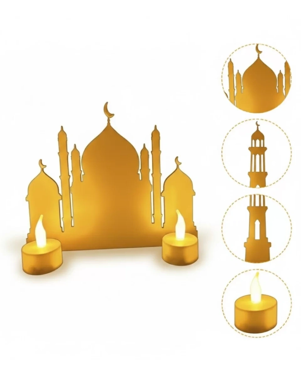 3D İki Mumlu Cami Dekor, Ramazan ayının huzurlu atmosferini evinize taşımak için tasarlanmış şık ve anlamlı bir dekoratif üründür. Ürün ile birlikte 2 adet pilli LED mum hediye olarak gönderilmektedir.LED mumlar güvenli kullanım sunar, gerçek alev içermez ve sıcak sarı ışık efekti sayesinde ortamda yumuşak bir ambiyans oluşturur. Özellikle iftar sofralarında, konsol üstünde veya TV ünitesinde etkileyici bir görünüm sağlar.Cami siluet tasarımı loş ortamda arka fonda zarif bir ışık yayarak dekorasyonunuza manevi bir dokunuş katar. Hem gündüz hem gece kullanım için idealdir.