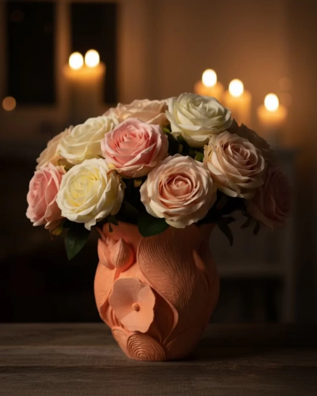 3D özel üretim teknolojisi ile tasarlanmış bu turuncu vazo, detaylı çiçek kabartmaları sayesinde bulunduğu ortamda dikkat çeker. Modern ve enerjik tasarımı ile minimal alanlara sıcak bir dokunuş katar.Hem fonksiyonel hem dekoratif kullanım sunar.