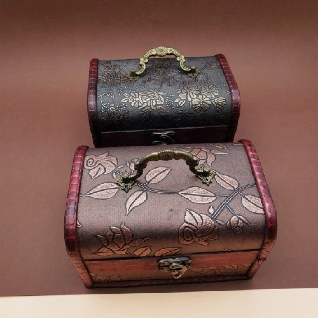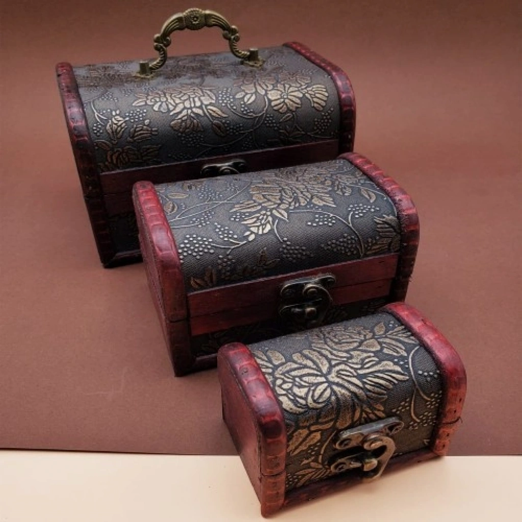 3'lü Ahşap Deri Sandık Kutusu3'lü ahşap ahşap deri sandık kutusu tasarımı görünümü ve işlevselliği ile dikkat çekmekte.Ahşap deri sandık kutu iç içe 3 boy çıkmakta olup hangi boyu isterseniz çıkartıp işinizi görebilir diğer iki boyuda iç içe koyup yerden tasaruf edebilirsiniz.Özel el yapımı el işçiliği ile üretilmiş olup eskitme nostaljik görünüm Kutu ile sizleri eskiye götürecek.Ahşap sandık kutusuna küçük özel eşyalarınızı koyup saklayabilirsiniz.3'lü ahşap deri kutu sevdiklerinize verebileceğiniz nostaljik hediye kutusu.Ahşap deri kutu üzerinde farklı desenler olup her bir desen hediye kutusunu oldukça şık bir görünüm haline getiriyor. Ahşap Deri Sandık Kutusu, 3'lü Deri Ahşap Sandık, Sandık Özellikleri:* Kaliteli ahşap malzemeden üretilmiştir.* Ahşap sandık kutu üzerinde desenler bulunmkatadır.* Karışık modellerde gönderilmektedir.* Tasarımı ve görüntüsü ile dikkat çekmektedir.* Vintage Nostaljik görünüm.* Büyükten küçüğe iç içe 3 adet çıkmaktadır.Ahşap Sandık, Deri Ahşap Sandık Kutu, Ahşap Hediye Kutusu:Büyük Boy Kutu Ölçüsü: 10.5 cm x 15.5 cm x 5.5 cmOrta Boy Kutu Ölçüsü: 8 cm x 12 cm x 4 cm Küçük Boy Kutu Ölçüsü: 5.5 cm x 8 cm x 2.5 cm