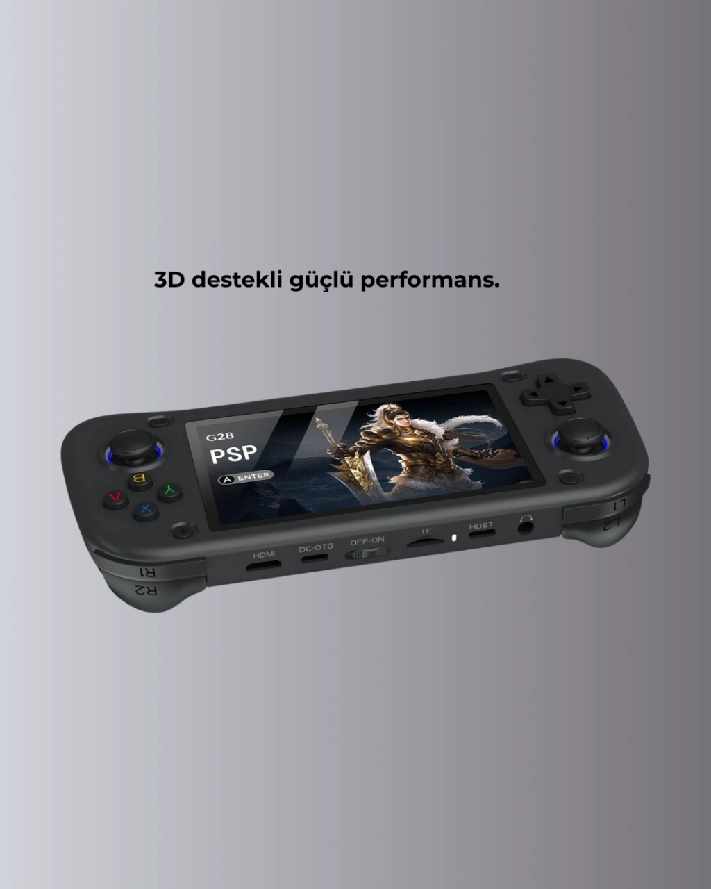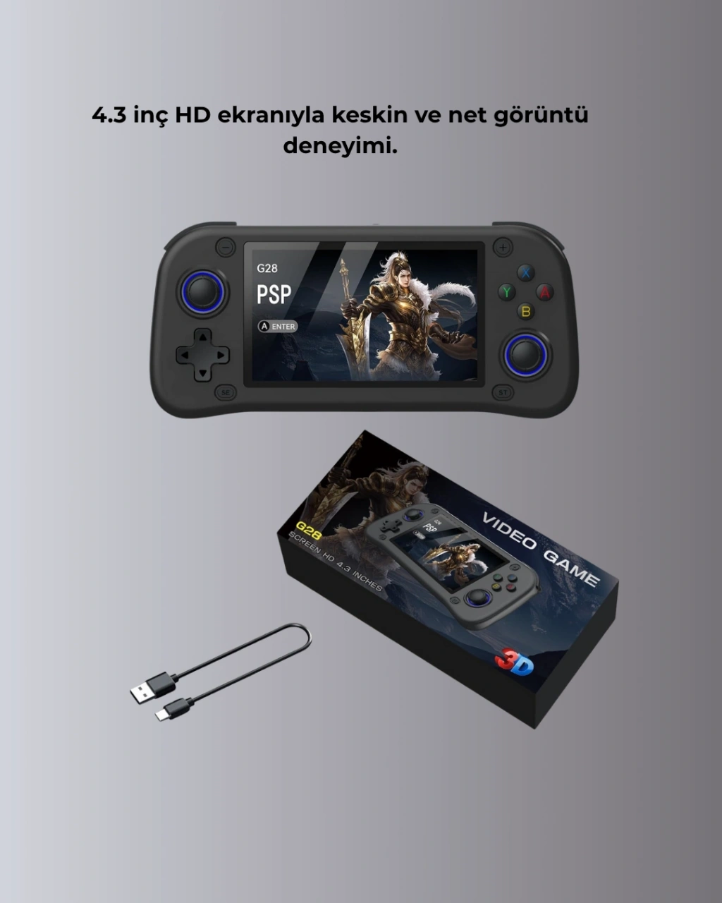 Taşınabilir oyun konsolu, 64GB hafıza kartı ve 10000 yüklü oyunla birlikte gelir. PSP, arcade, GBA, NES, Sega gibi popüler emülatörleri destekler. Ayrıca yeni oyunları da kolayca yükleyerek keyfinizi çeşitlendirebilirsiniz.Avuç içi büyüklüğündeki tasarımı sayesinde her yerde yanınızda taşıyabilirsiniz. Metroda, seyahatte, tatilde veya evde boş zamanlarınızı eğlenceli hale getirmek için idealdir.Konsol, 64 bit RK3128 Cortex-A7 işlemci ve 4GB DDR3L RAM ile donatılmıştır. Bu güçlü sistem, daha hızlı ve akıcı oyun deneyimi sağlar. Yepyeni yazılım altyapısı sayesinde gecikmesiz oyun keyfi sunar.4.3 inç IPS ekran, 640x480 çözünürlük ile oyunları canlı ve net görüntüler. Geniş izleme açısı sayesinde oyunları gerçekçi renklerle deneyimleyebilirsiniz.Kompakt yapısı, kolay taşınabilirliği ve modern tasarımıyla yalnızca oyun için değil, aynı zamanda harika bir hediye seçeneği olarak da öne çıkar. Çocuklar, gençler veya retro oyun seven yetişkinler için mükemmel bir tercihtir.