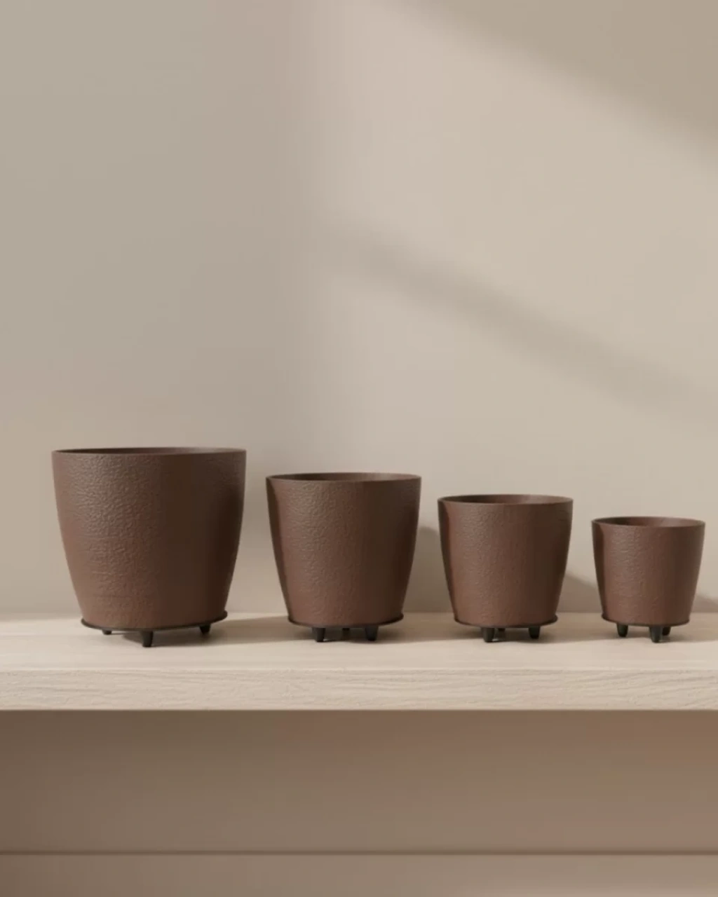 Doğal toprak tonlarının sıcaklığını modern tasarım çizgileriyle buluşturan 4’lü 3D Kahverengi Dekoratif Vazo Seti, yaşam alanlarınıza sofistike ve dengeli bir atmosfer kazandırır. Zengin kahverengi tonu, bulunduğu mekâna doğallık ve huzur hissi taşırken, 3D dokulu yüzeyi ürüne derinlik ve premium bir karakter kazandırır. Büyükten küçüğe doğru sıralanan dört farklı boy alternatifi sayesinde hem dekoratif bütünlük sağlar hem de profesyonel bir kompozisyon oluşturmanıza yardımcı olur.Alt kısmında yer alan zarif siyah ayak detayları tasarımı sıradan saksılardan ayırır. Zeminden hafifçe yükselen yapısı sayesinde hem estetik bir duruş sunar hem de modern dekorasyon anlayışına uyum sağlar. Raf üzerinde, balkon masasında, salon sehpasında ya da ofis köşesinde kullanıldığında mekâna güçlü bir stil dokunuşu katar.3D yüzey dokusu ışığı yumuşak şekilde yansıtarak ürünün dokusunu daha belirgin hale getirir. İçine yerleştireceğiniz canlı bitkiler, sukulentler ya da çiçeklerle birlikte doğallığın zarif bir temsilcisine dönüşür. Hem iç hem dış mekân kullanımına uygundur. Dayanıklı ve hafif yapısı sayesinde uzun süreli kullanım sağlar.Modern, zamansız ve şık bir dekoratif çözüm arayanlar için bu 4’lü kahverengi vazo seti hem estetik hem işlevsel bir tercihtir.