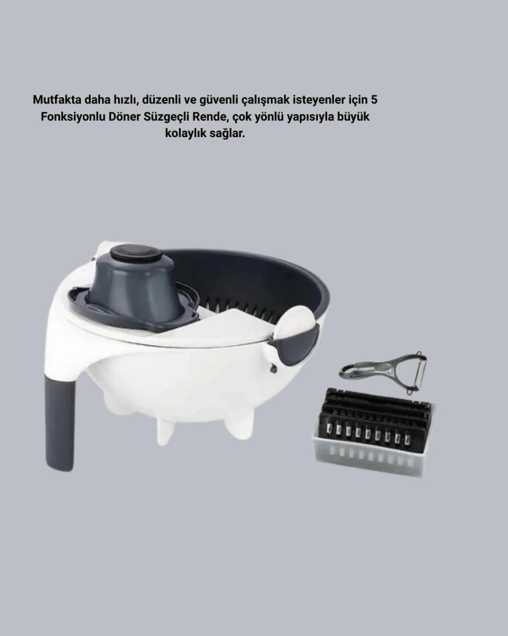 Mutfakta hız, düzen ve güvenlik isteyen kullanıcılar için tasarlanan 5 Fonksiyonlu Döner Süzgeçli Rende, çok yönlülüğü sayesinde yemek hazırlama sürecini daha pratik ve keyifli hale getirir. Ürün, döner mekanizmalı akıllı yapısı ile farklı rende ve doğrama fonksiyonlarını tek cihazda toplar. Böylece sebze ve meyveleri ince rendeleme, kalın rendeleme, şerit kesme, yuvarlak dilimleme veya klasik doğrama şeklinde birkaç saniye içinde hazırlayabilirsiniz.Cihazın döner mekanizması, bıçakların tek bir hareketle kolayca değiştirilmesini sağlar. Bu fonksiyon, özellikle çok çeşit sebzeyle çalışırken büyük zaman tasarrufu sunar. Havucunuzu şerit, salatalığınızı dilim, patatesinizi ince rende yapmak için ayrı ayrı ürün kullanmaya gerek kalmaz.Hazne kısmı, rendeleme ve doğrama sırasında parçalanan yiyecekleri toplar; böylece tezgâhta dağınıklık oluşmaz. Aynı hazne aynı zamanda süzgeç işlevi gördüğünden, doğradığınız sebzeleri hemen yıkayıp süzebilir, ekstra kap kullanmadan işlemi tamamlayabilirsiniz. Bu özellik, mutfakta hem temizlik hem düzen açısından büyük avantaj sağlar.Kaymaz tabanı, kullanım sırasında ürünün sabit durmasını sağlar ve olası kaymaları engeller. Bu güvenlik detayı, kesme işlemlerini daha kontrollü ve rahat hale getirir. Buna ek olarak el koruma aparatı, özellikle küçük sebzelerin doğranmasında ellerinizi bıçaklardan uzak tutarak güvenli kullanım sunar.Ergonomik gövdesi sayesinde elinizle rahat kavrayabilir, uzun süreli kullanımlarda bile yorulma yaşamazsınız. Kompakt formu mutfak dolaplarında fazla yer kaplamaz, hafif yapısı ile kolay taşınır. Bıçakları paslanmaz çelikten üretilmiştir ve uzun ömürlü kullanım sağlar. Cihazın tüm plastik aksamı gıda ile temasa uygun ve hijyeniktir.Kolay sökülebilir parçaları sayesinde temizlik süreci son derece pratiktir. Su altında hızlıca yıkanabilir, hijyenik şekilde saklanabilir.Evde yemek hazırlamayı sevenlerden profesyonel mutfaklarda çalışanlara kadar herkes için ideal olan bu döner süzgeçli rende, mutfağınızın vazgeçilmez yardımcılarından biri olacak.
