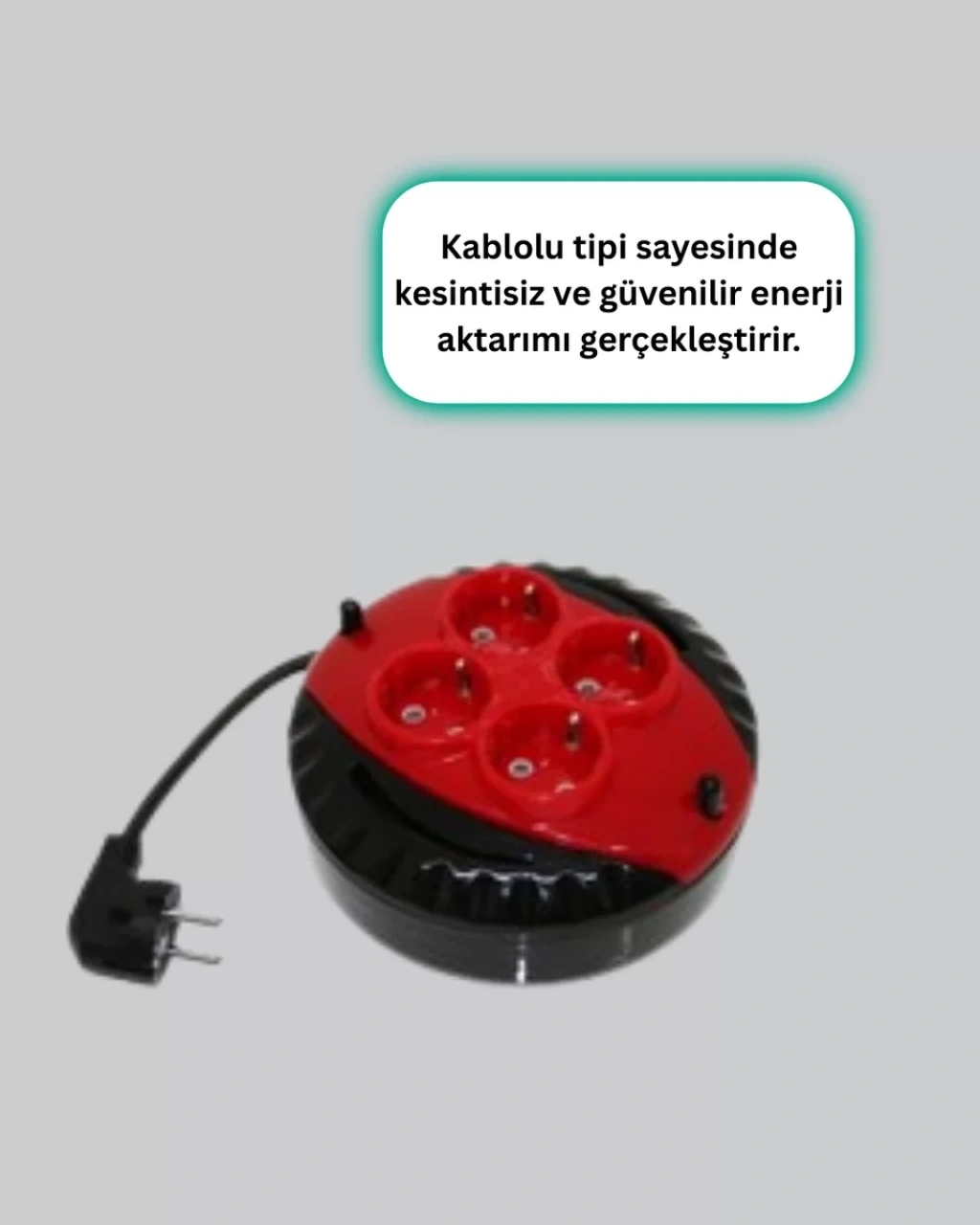 5 metre uzunluğundaki kablosu sayesinde geniş bir kullanım alanı sunan bu kablolu priz makarası, ev ve ofis ortamlarında elektrik erişimini pratik hale getirir. Uzun kablo mesafesi, prizden uzak noktalarda dahi rahat kullanım imkânı sağlar. 4 adet priz kapasitesi ile aynı anda birden fazla cihazın bağlanmasına olanak tanır ve günlük elektrik ihtiyaçlarını karşılar.Kırmızı renkli gövdesi sayesinde dikkat çekici ve kolay fark edilebilir bir tasarıma sahiptir. Kablolu tipi sayesinde kesintisiz ve güvenilir enerji aktarımı sağlar. Türkiye menşeli üretimi ile yerli üretim kalitesini yansıtır. CE uygunluk sembolü ile güvenlik standartlarına uygun olarak üretilmiştir. Ev, ofis ve çalışma alanları için ideal bir çözümdür.