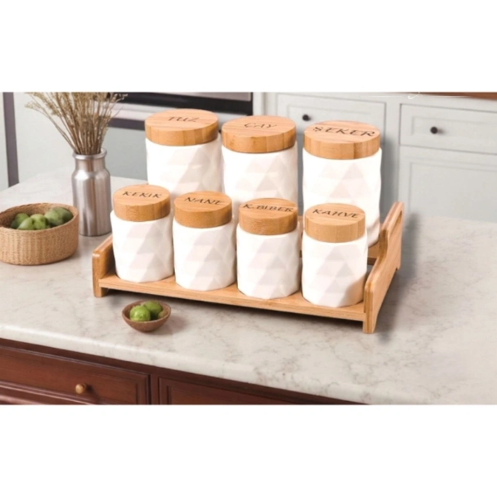 Şık ve fonksiyonel tasarımıyla 7'li Standlı Baharat Seti, mutfak düzeninizi tamamlayan zarif bir üründür. Beyaz seramik kapaklı baharatlıklar, modern ve minimalist bir görünüme sahiptir. Ahşap standı sayesinde düzenli kullanım sağlar ve mutfağınızda yer kaplamadan şık bir dokunuş ekler. Tuz, şeker, çay, kahve ve baharatları güvenle saklamak için idealdir. Kapakları sayesinde baharatlarınızı taze tutar ve hijyenik kullanım sunar.Paket İçeriği1 Adet Ahşap Stand7 Adet Seramik Kapaklı Baharatlık