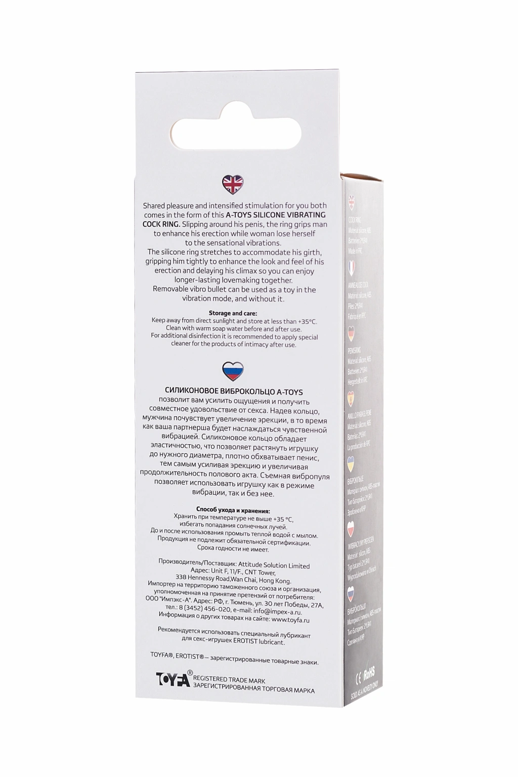 A-Toys Titreşim Penis Halkası, hislerinizi güçlendirmenize ve birlikte seks yapmaktan zevk almanıza izin verecektir. Halkayı taktıktan sonra, bir erkek ereksiyonda bir artış hissedecek, partneriniz ise şehvetli titreşimin tadını çıkaracaktır. Penis halkasının elastikiyeti vardır, bu da oyuncağı istenilen çapa kadar uzatmanıza, penisini sıkıca sarmanıza, böylece ereksiyonu güçlendirmenize ve cinsel ilişki süresini uzatmanıza olanak tanır. Çıkarılabilir bir titreşim çubuğu, oyuncağı hem titreşim modunda hem de titreşimsiz modda kullanmanıza izin verir. Genel halka boyutu: 6.3 cm Çap: 3.1 cm