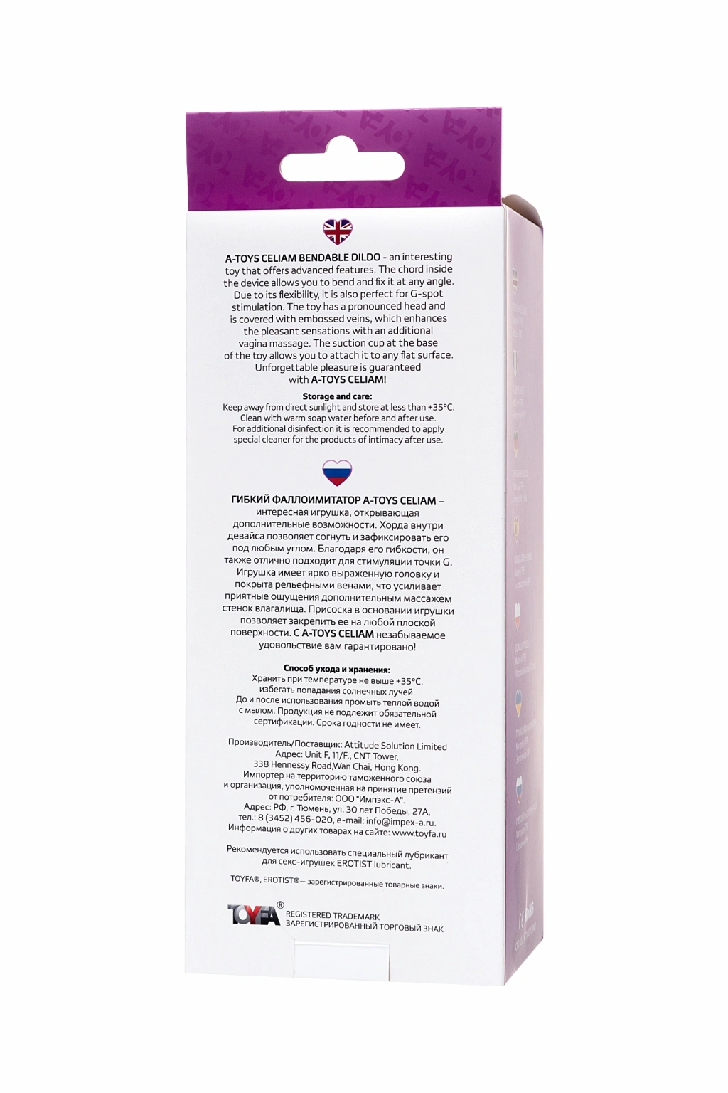 A-Toys Celiam esnek yapay penis, ek olasılıkların kilidini açan ilginç bir oyuncaktır. Ürünün içindeki esnek iskelet yapı, onu herhangi bir açıda bükmenizi ve sabitlemenizi sağlar. Esnekliğinden dolayı, G noktasını uyarmak için de mükemmeldir. Oyuncağın belirgin bir başı vardır ve belirgin damarlarla kaplıdır, bu da vajinanın duvarlarına ek bir masaj yaparak hoş hisleri arttırır. Oyuncağın tabanındaki vantuz, onu herhangi bir düz yüzeye sabitlemenizi sağlar. A-Toys Celiam ile unutulmaz bir eğlence garantilidir! Toplam uzunluk: 20.5 cm Çalışma uzunluğu: 14.5 cm Çap: 3.4 cm