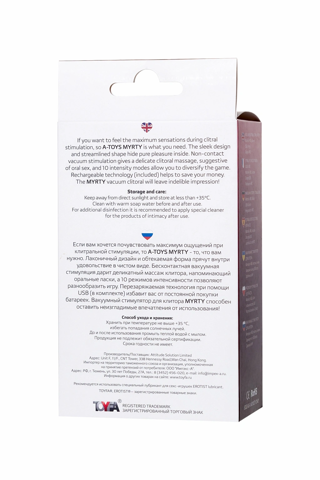 Mastürbatörde maksimum his hissetmek istiyorsanız, o zaman A-Toys Myrty ihtiyacınız olan şeydir. Özlü tasarım ve aerodinamik şekil, eğlencenin içinde en saf haliyle gizlenir. Temassız vakum stimülasyonu, oral okşamaya benzeyen hassas bir klitoral masaj sağlar ve 10 çalışma modu oyunu çeşitlendirmenize izin verir. USB ile şarj edilebilir teknoloji (USB dahil) sizi sürekli pil satın almanızdan kurtarır. Myrty Mastürbatörü vakum stimülatörü, kullanımdan silinmez izlenimler bırakabilir!