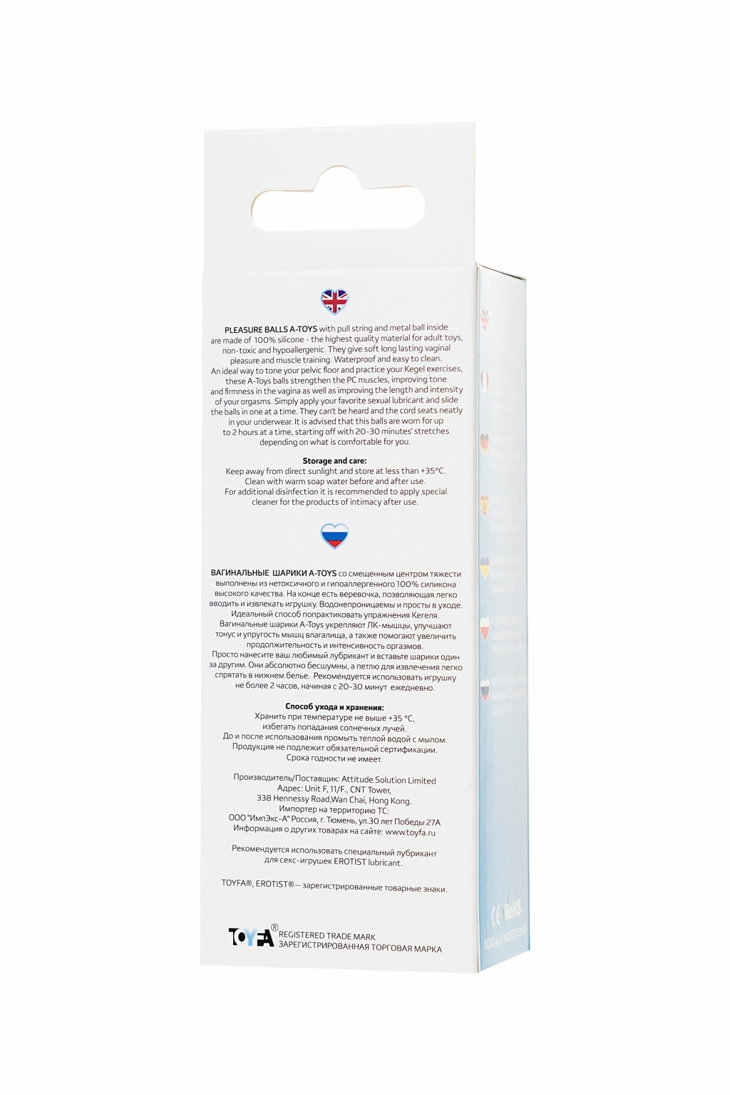 Ofset ağırlık merkezine sahip A-Toys Trot vajinal topları, toksik olmayan ve hipoalerjenik %100 yüksek kaliteli silikondan yapılmıştır. Sonunda, oyuncağın kolayca girilmesini ve çıkarılmasını sağlayan bir halka var. Su geçirmez ve bakımı kolaydır. Kegel egzersizlerini uygulamak için mükemmel bir yol. Vajinal A-Toys topları LC kaslarını güçlendirir, vajinal kasların tonunu ve elastikiyetini arttırır ve orgazmların süresini ve yoğunluğunu arttırmaya yardımcı olur. En sevdiğiniz kayganlıştırıcıyla uygulayın ve topları tek tek kulanın. Tamamen sessizler ve çıkarma halkasını iç çamaşırlarına saklamak kolaydır. Oyuncağı günde 20-30 dakikadan başlayarak en fazla 2 saat kullanmanız önerilir.