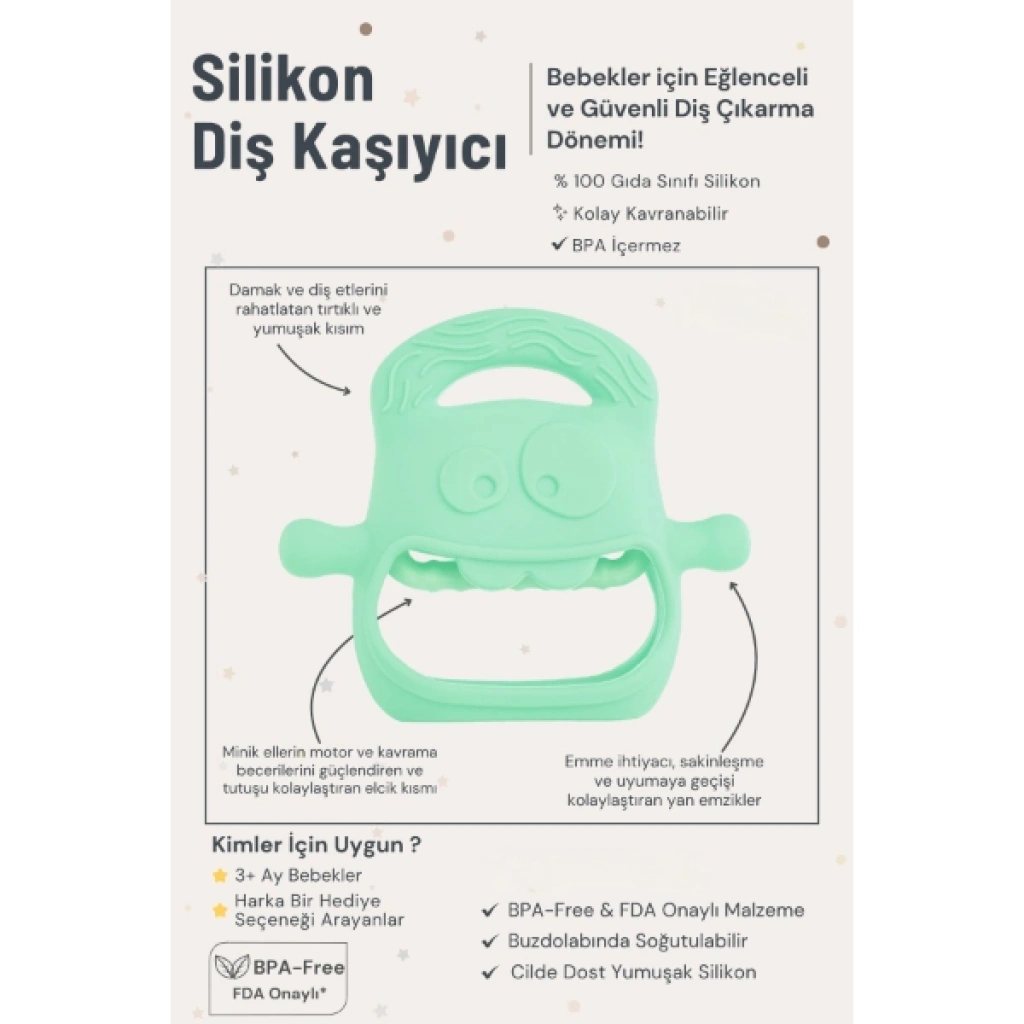 Açık yeşil silikon bebek diş kaşıyıcı, bebeklerin diş çıkarma sürecini güvenli ve konforlu hale getirir. Sevimli ve modern tasarımı, farklı dokulara sahip yüzeyleri ve ergonomik tutma alanları sayesinde minik eller için kolay kavrama sağlar. Hassas diş etlerine nazikçe masaj yaparak bebeklere huzurlu bir rahatlama sunar.Çift yönlü emzik kolları, doğal emme refleksini desteklerken parmak emme alışkanlığını azaltmaya yardımcı olur. Aynı zamanda çene kaslarını çalıştırarak ağız ve çene gelişimini teşvik eder. Hafif ve esnek yapısı, bebeklerin kendi başına kolayca tutabilmesini sağlar.Diş kaşıyıcı yalnızca rahatlatıcı bir ürün değil, aynı zamanda motor ve duyusal gelişimi destekleyen bir oyun arkadaşıdır. Çeşitli tutma bölgeleri bebeğin kavrama becerilerini artırırken, yumuşak silikon yüzeyi dokunsal keşfi destekler. %100 gıda sınıfı silikon malzemeden üretilmiş olup BPA, BPS ve zararlı kimyasallar içermez. Yenidoğan döneminden itibaren güvenle kullanılabilir.Paket İçeriği1 adet Açık Yeşil Bebek Silikon Diş Kaşıyıcı 1 adet:AÇIK YEŞİL BEBEK SİLİKON DİŞ KAŞIYICIÜrün ÖzellikleriAçık yeşil silikon bebek diş kaşıyıcı, bebeklerin diş çıkarma sürecini güvenli ve konforlu hale getirir. Sevimli ve modern tasarımı, farklı dokulara sahip yüzeyleri ve ergonomik tutma alanları sayesinde minik eller için kolay kavrama sağlar. Hassas diş etlerine nazikçe masaj yaparak bebeklere huzurlu bir rahatlama sunar.Çift yönlü emzik kolları, doğal emme refleksini desteklerken parmak emme alışkanlığını azaltmaya yardımcı olur. Aynı zamanda çene kaslarını çalıştırarak ağız ve çene gelişimini teşvik eder. Hafif ve esnek yapısı, bebeklerin kendi başına kolayca tutabilmesini sağlar.Diş kaşıyıcı yalnızca rahatlatıcı bir ürün değil, aynı zamanda motor ve duyusal gelişimi destekleyen bir oyun arkadaşıdır. Çeşitli tutma bölgeleri bebeğin kavrama becerilerini artırırken, yumuşak silikon yüzeyi dokunsal keşfi destekler. %100 gıda sınıfı silikon malzemeden üretilmiş olup BPA, BPS ve zararlı kimyasallar içermez. Yenidoğan döneminden itibaren güvenle kullanılabilir.Paket İçeriği1 adet