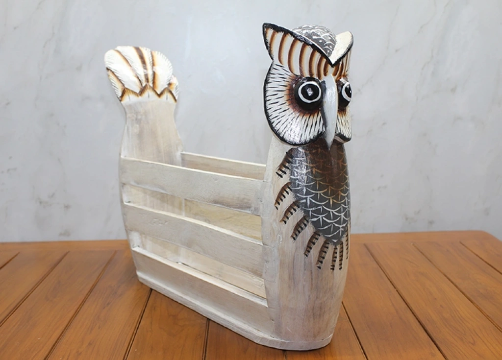 Doğal ahşaptan üretilen baykuş figürlü gazetelik, 33x43 cm boyutundadır. Estetik ve dekoratif tasarımıyla gazete, dergi ve kitaplarınızı düzenli bir şekilde saklamanızı sağlar. El işçiliğiyle özenle hazırlanmış olan bu ürün, ev ve ofis dekorasyonuna şık bir dokunuş katar. Ahşap dokusu sayesinde uzun ömürlü ve dayanıklı bir kullanım sunar.Paket İçeriği1 adet ahşap baykuş gazetelik.