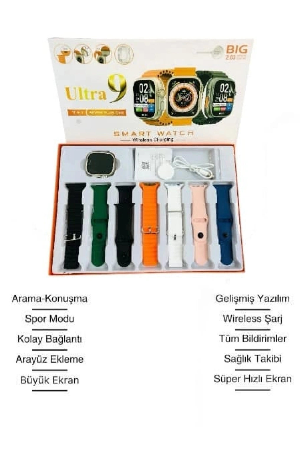 Geniş ve Net Görüntü: 2.09 inç HD IPS ekranıyla canlı ve net bir görüntü deneyimi sunar. Kare tasarımı ve tam uyumlu dokunmatik ekranı sayesinde kullanım kolaylığı sağlar. Bağlantı ve Kullanım Kolaylığı: Android ve iOS cihazlarla tam uyumlu çalışan bu saat, çağrı almayı, bırakmayı ve arama yapmayı pratik hale getirir. Bildirimlerinizi doğrudan kontrol eder ve telefona ihtiyaç duymadan iletişim kurabilirsiniz. Sağlık Takibi ve Spor Modları: Uyku izleme, kalori takibi, kalp atış hızı, kan basıncı ölçme gibi sağlık özellikleriyle günlük yaşamınızda size destek olur. Çoklu spor modu sayesinde egzersizlerinizi detaylı bir şekilde takip edebilirsiniz. Dayanıklı Tasarım: Toz ve suya dayanıklılığı sayesinde her türlü hava koşulunda güvenle kullanılabilir. Modern, sportif ve klasik tasarımları bir araya getiren 7 farklı kordon seçeneğiyle tarzınıza uyum sağlar. Güçlü Batarya ve Ek Özellikler: Yüksek kapasiteli polimer pili ile uzun kullanım süresi sunar. Bluetooth araması, uzaktan müzik ve fotoğraf kontrolü, saat, hava durumu, telefon bulma, kronometre gibi ek özelliklerle hayatınızı kolaylaştırır.