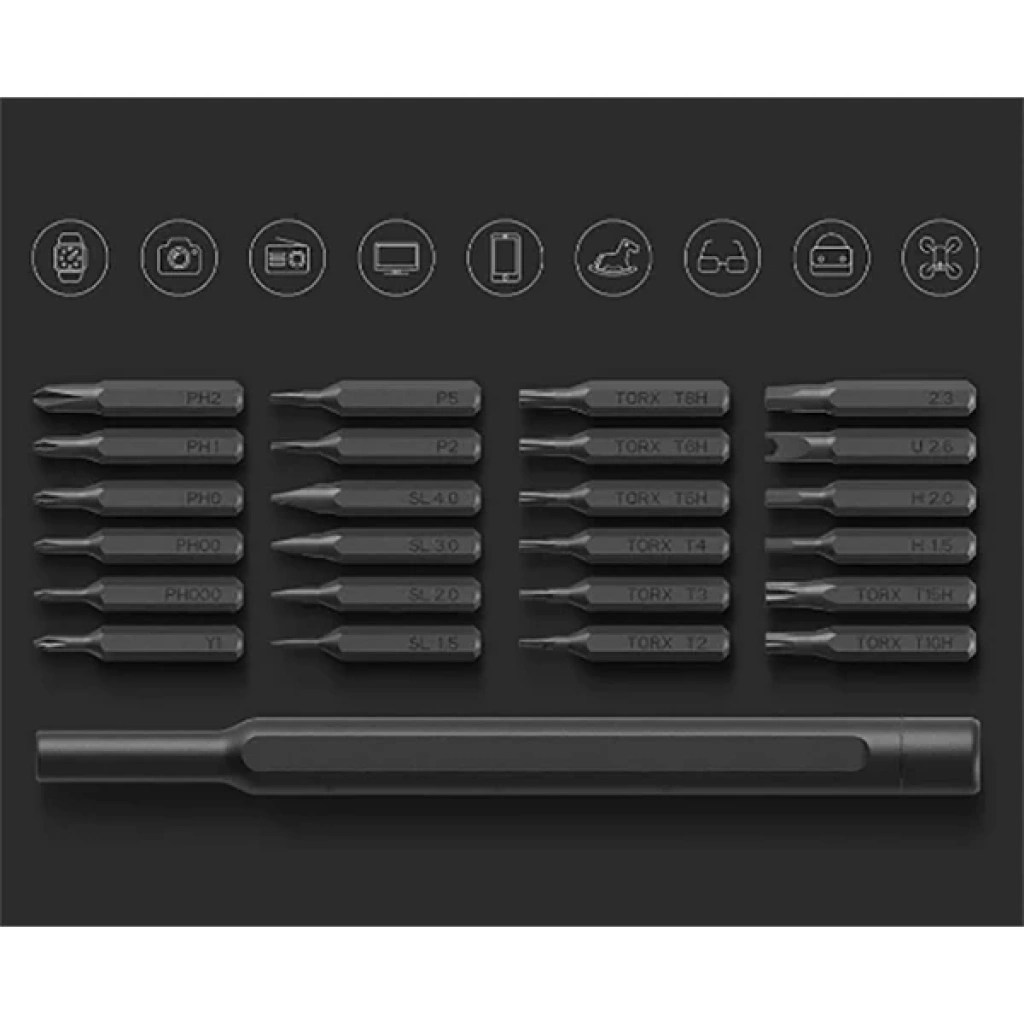 Paket içeriği: 1 x tornavida kolu, 24 x bit, 1 x alüminyum alaşım saklama kutusu