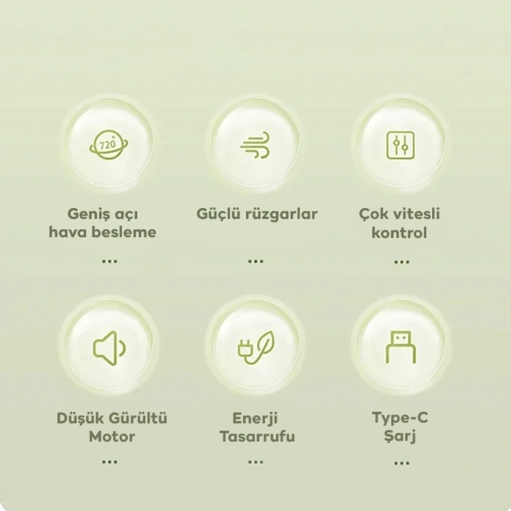 Ally Taşınabilir Ergonomik Ev Ofis Sessiz VantilatörMalzeme: ABS/PP/Electronic componentPil: Li-ion 18650-3.7VBatarya Kapasitesi:1200mAhRüzgar Kuvvetini ayar ama için üç seviyeli kompinasyonDüşük Gürültülü MotorEnerji Tasarrufu Sağlar