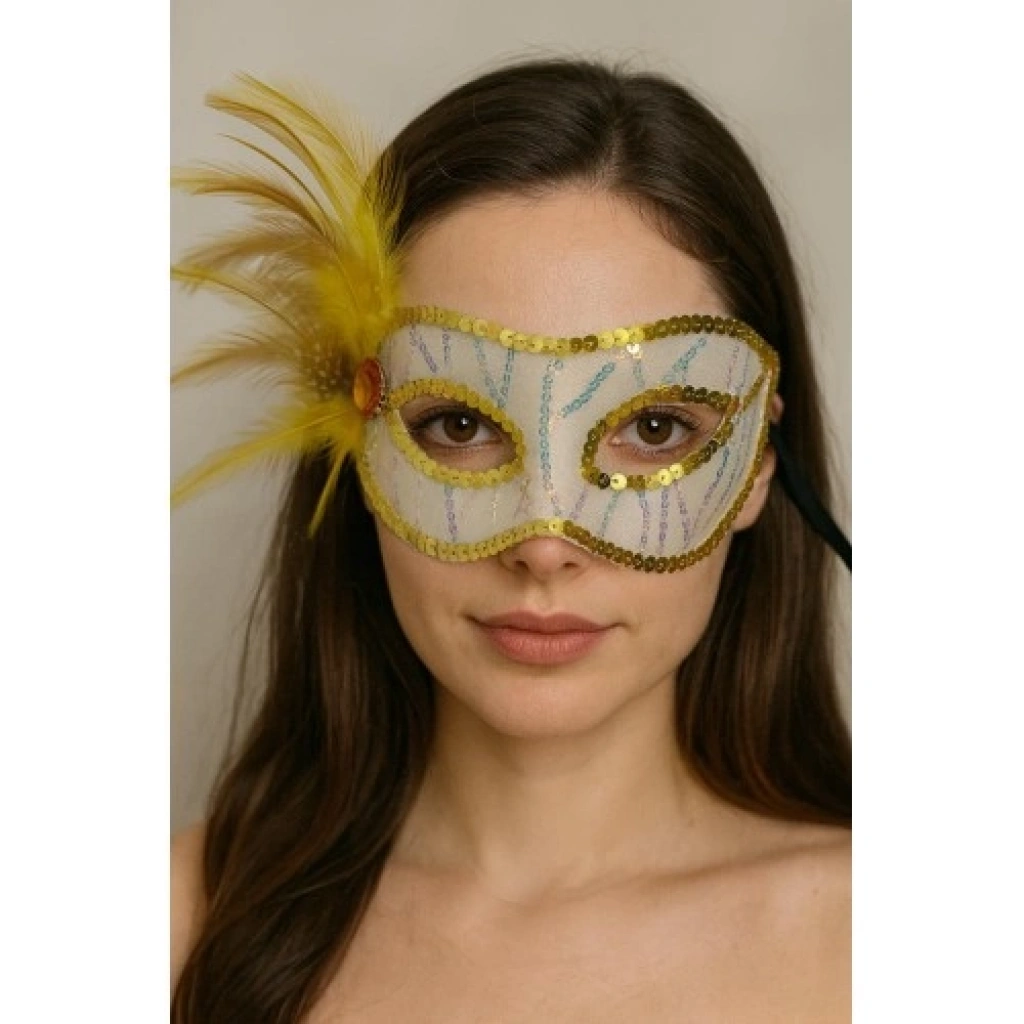 ve AvantajlarıGöz Alıcı Altın Işıltısı: Maskenin yüzeyi ışığı her açıdan yansıtacak yüksek kaliteli altın rengi pul ve payetlerle kaplanmıştır. Hareket ettikçe parlayan yapısı tüm dikkatleri üzerinize çeker.Zarif Yan Tüy Detayı: Yan tarafta konumlandırılmış yumuşak ve hacimli altın tonlarındaki tüyler, maskeye sofistike bir silüet ve dramatik bir hava kazandırır.Hafif ve Ergonomik Tasarım: 23x12 cm ölçülerindeki maske, hafif plastik gövdesi sayesinde yüzünüze tam uyum sağlar ve uzun süreli etkinliklerde bile konfor sunar.Kaliteli İşçilik: Birinci sınıf tüy, pul ve dayanıklı plastik malzemeden üretilmiştir. Pullarda dökülme yapmaz ve formunu koruyarak defalarca kullanılabilir.Unisex ve Şık: Hem kadın hem de erkek kullanıcılar için uygun olan bu aksesuar, her türlü abiye veya kostümle mükemmel bir kontrast oluşturur.Kullanım AlanlarıVenedik Karnavalları ve Maskeli Balolar: Gizemin ve ihtişamın ön planda olduğu davetlerin vazgeçilmez aksesuarıdır.Yılbaşı ve Gala Geceleri: Yeni yılı veya özel bir kutlamayı altın renginin görkemiyle karşılamak için idealdir.Düğün ve After Party: Farklılık yaratmak isteyen gelinler, nedimeler veya misafirler için eğlenceli ve lüks bir dokunuş.Tiyatro ve Sahne Performansları: Sahne ışıkları altında pul ve payetlerin yarattığı yansımalarla büyüleyici bir görsel sunar.