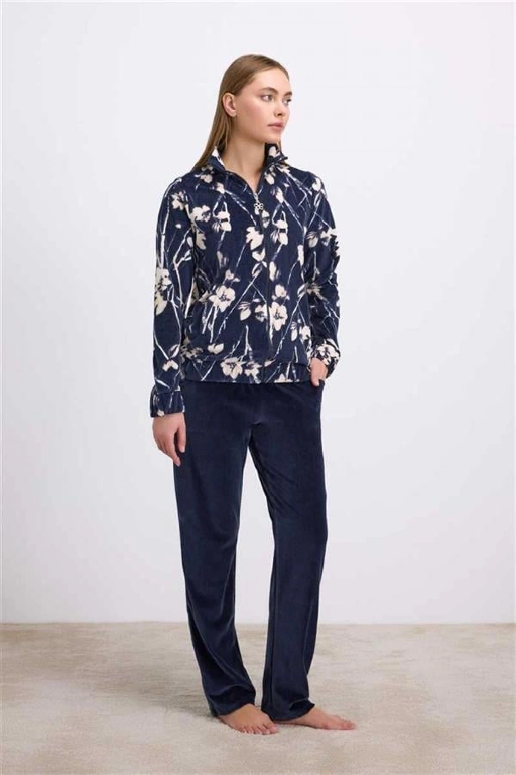 VipMarketim Anemon Kadın Uzun Kollu Çiçek Desenli Fermuarlı Sweatshirt Ve Düz Kadife Pantolon Takım (Kod:11535)
