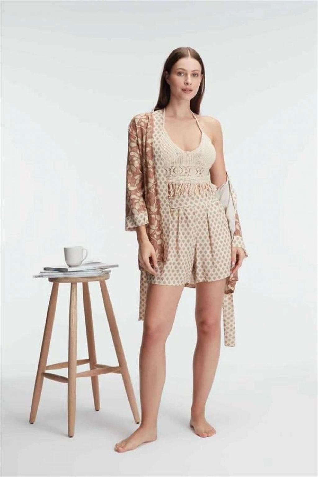 VipMarketim Anıl İp Askılı V Yaka Kadın Cotton Çiçek Desenli Yazlık Dokuma Mini Pijama Takımı Sabahlık (Kod:5831)