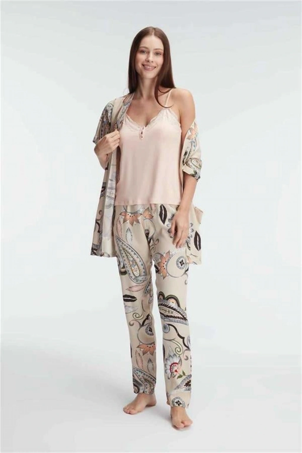 Vipmarketim Anıl İp Askılı V Yaka Kadin Viskon Çiçek Desenli Yazlık Dantel Detaylı Pijama Takımı Sabahlık (kod:5840)