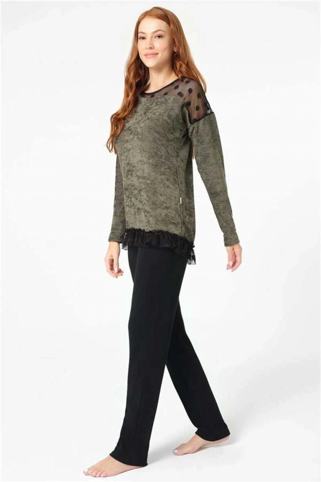 VipMarketim Anıl Uzun Kol Bisiklet Yaka Polyester Elastan Düz Kışlık Örme Normal Bel Transparan Tül Detaylı Pijama Takımı (Kod:9084)