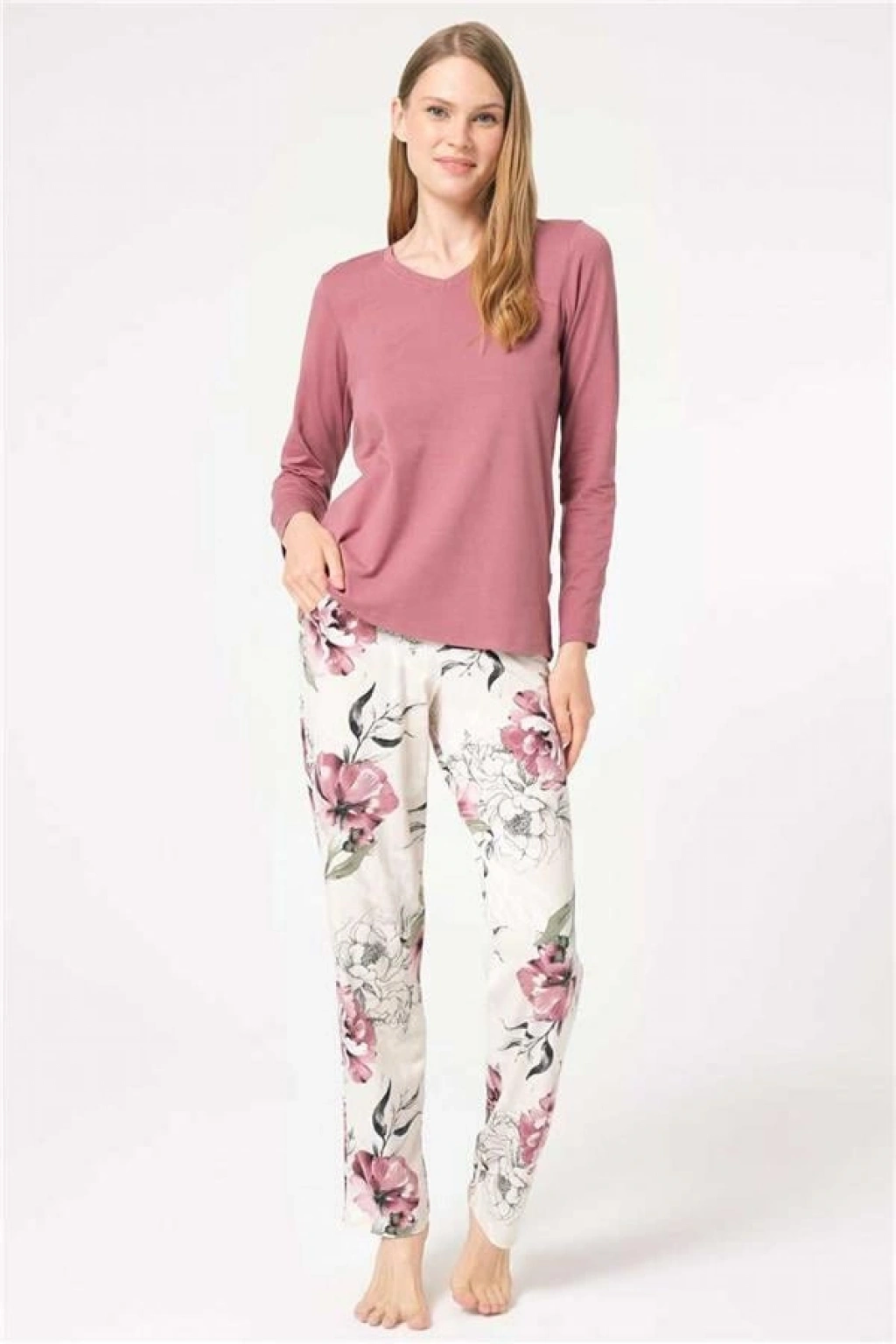 VipMarketim Anıl Uzun Kol V Yaka Bamboo Çiçek Desenli Kışlık Örme Normal Bel Transparan Tül Detaylı Pijama Takımı (Kod:9853)