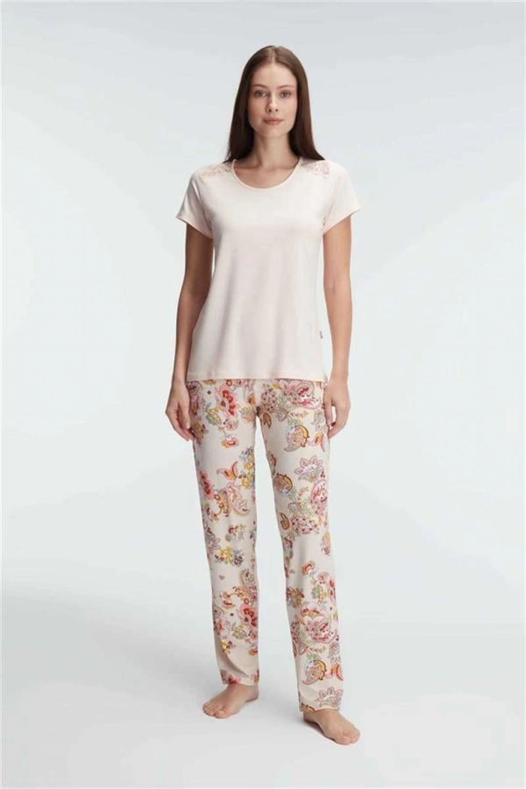 VipMarketim Anıl Kısa Kol Bisiklet Yaka Kadın Viskon Çiçek Desenli Yazlık Örme Dantel Detaylı Pijama Takımı (Kod:9878)
