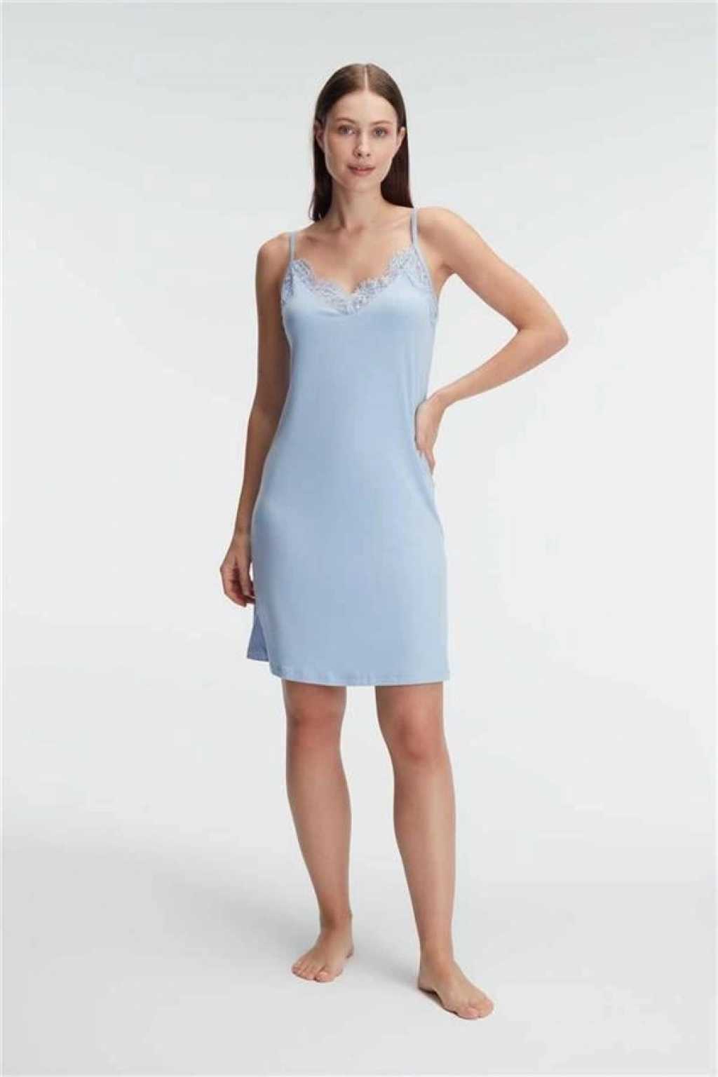 VipMarketim Anıl İp Askılı V Yaka Kadin Viskon Düz Yazlık Örme Normal Bel Mini Dantel Detaylı Gecelik (Kod:5834)