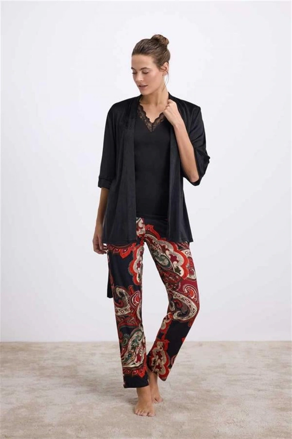 VipMarketim Anıl Kadın Desenli Pantolonlu 3’Lü Set – Sabahlık, Dantel Detaylı Atlet Ve Pantolon Takımı ( ) (Kod:11546)