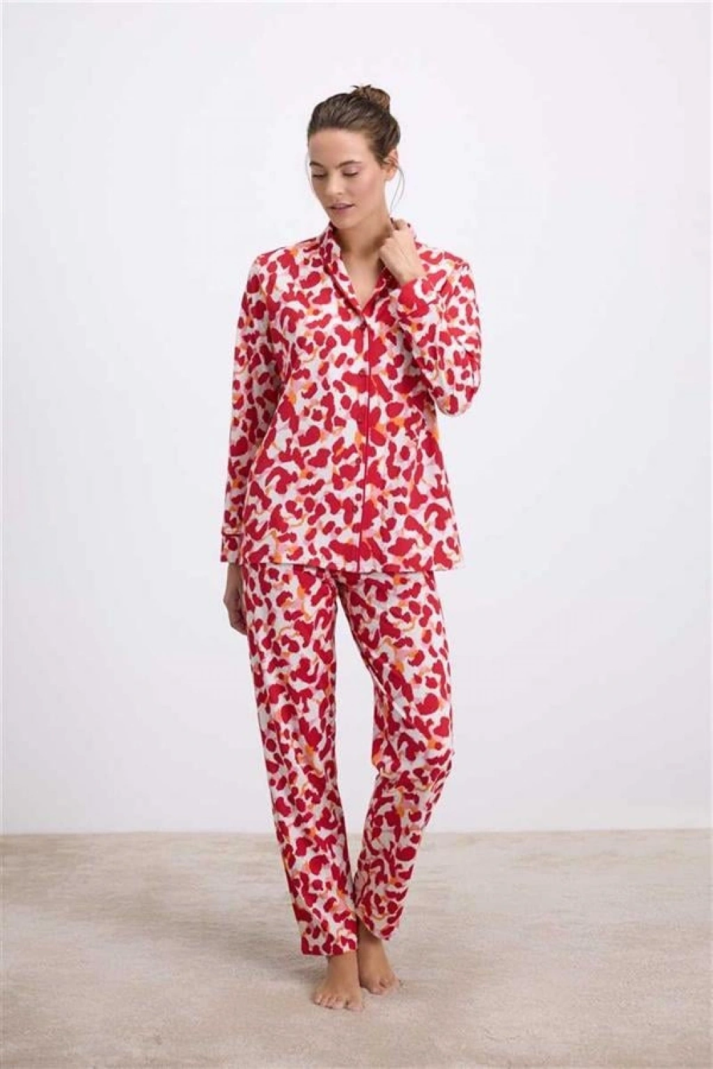 VipMarketim Anıl Kadın Desenli Uzun Kollu Gömlek Yaka Pijama Takımı Nefes Alabilir Yumuşak Kumaş (Jersey) (Kod:11564)