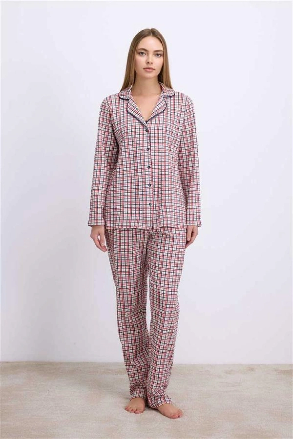 VipMarketim Anıl Kadın Pamuklu Uzun Kol Düğmeli Gömlek Ve Ekose Pantolon Pijama Takımı Zamansız Şıklık (Kod:11627)