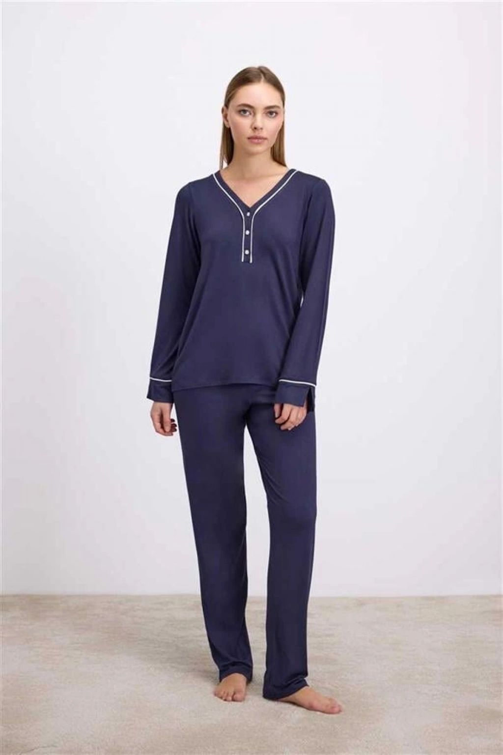 VipMarketim Anıl Kadın Uzun Kollu Pijama Takımı Şık Düğmeli Yaka Ve Kontrast Biyeli Tasarım ( ) (Kod:11613)