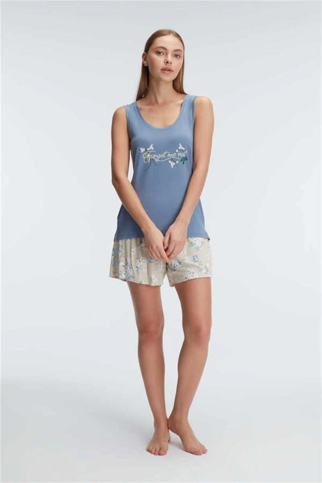 VipMarketim Anıl Kalın Askılı Bisiklet Yaka Kadın Viskon Çiçek Desenli Yazlık Örme Mini Pijama Takımı (Kod:9893)