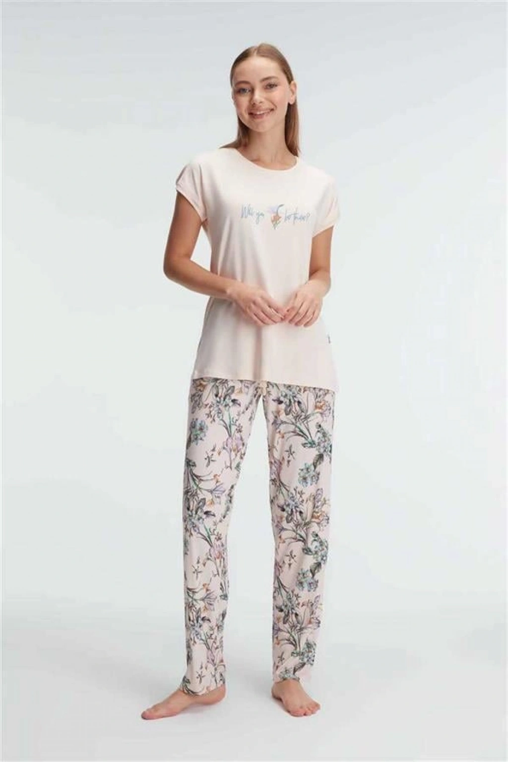 VipMarketim Anıl Kısa Kol Bisiklet Yaka Kadın Viskon Çiçek Desenli Yazlık Örme Normal Bel Pijama Takımı (Kod:9890)
