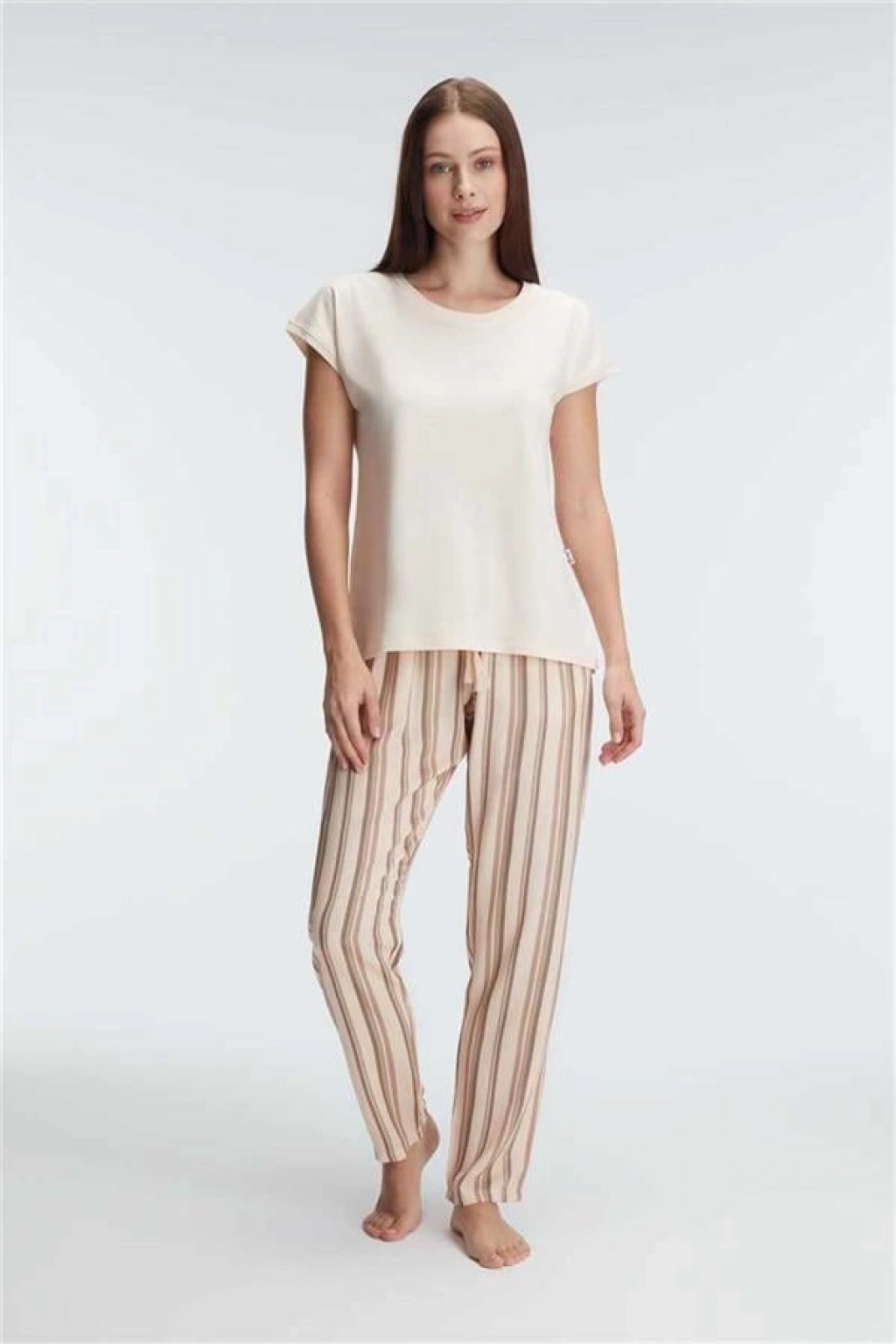 VipMarketim Anıl Kısa Kol Bisiklet Yaka Kadın Viskon Çizgili Desenli Yazlık Dokuma Normal Bel Pijama Takımı (Kod:9935)