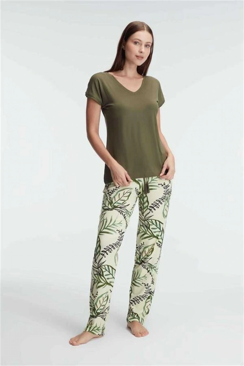 VipMarketim Anıl Kısa Kol V Yaka Kadın Viskon Çiçek Desenli Yazlık Örme Dantel Detaylı Pijama Takımı (Kod:9872)
