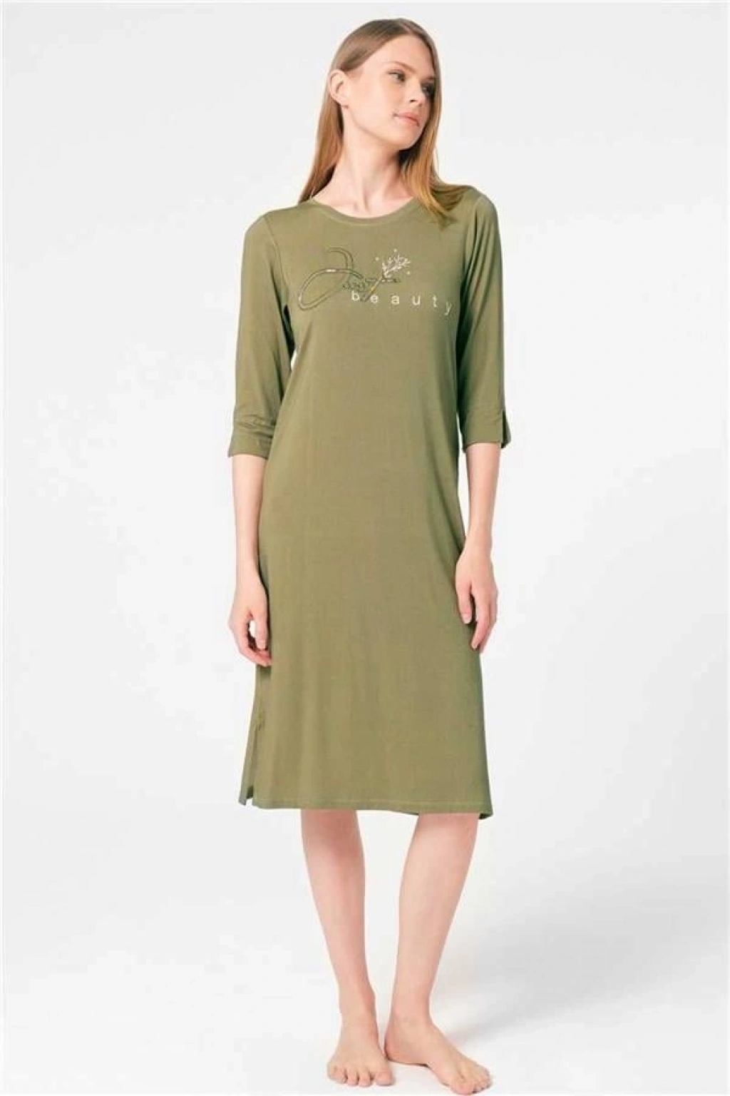 VipMarketim Anıl Kısa Yarım Kol Bisiklet Yaka Viskon Düz Kışlık Örme Nakış Detaylı Gecelik Sabahlık (Kod:5793)