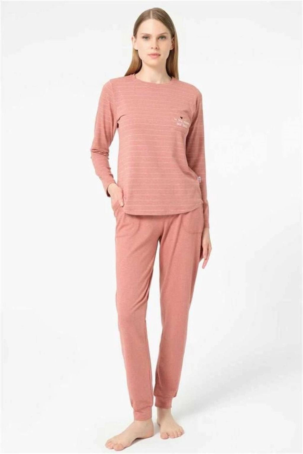 VipMarketim Anıl Uzun Kol Bisiklet Yaka Cotton Çizgili Kışlık Örme Normal Bel Pijama Takımı (Kod:9859)