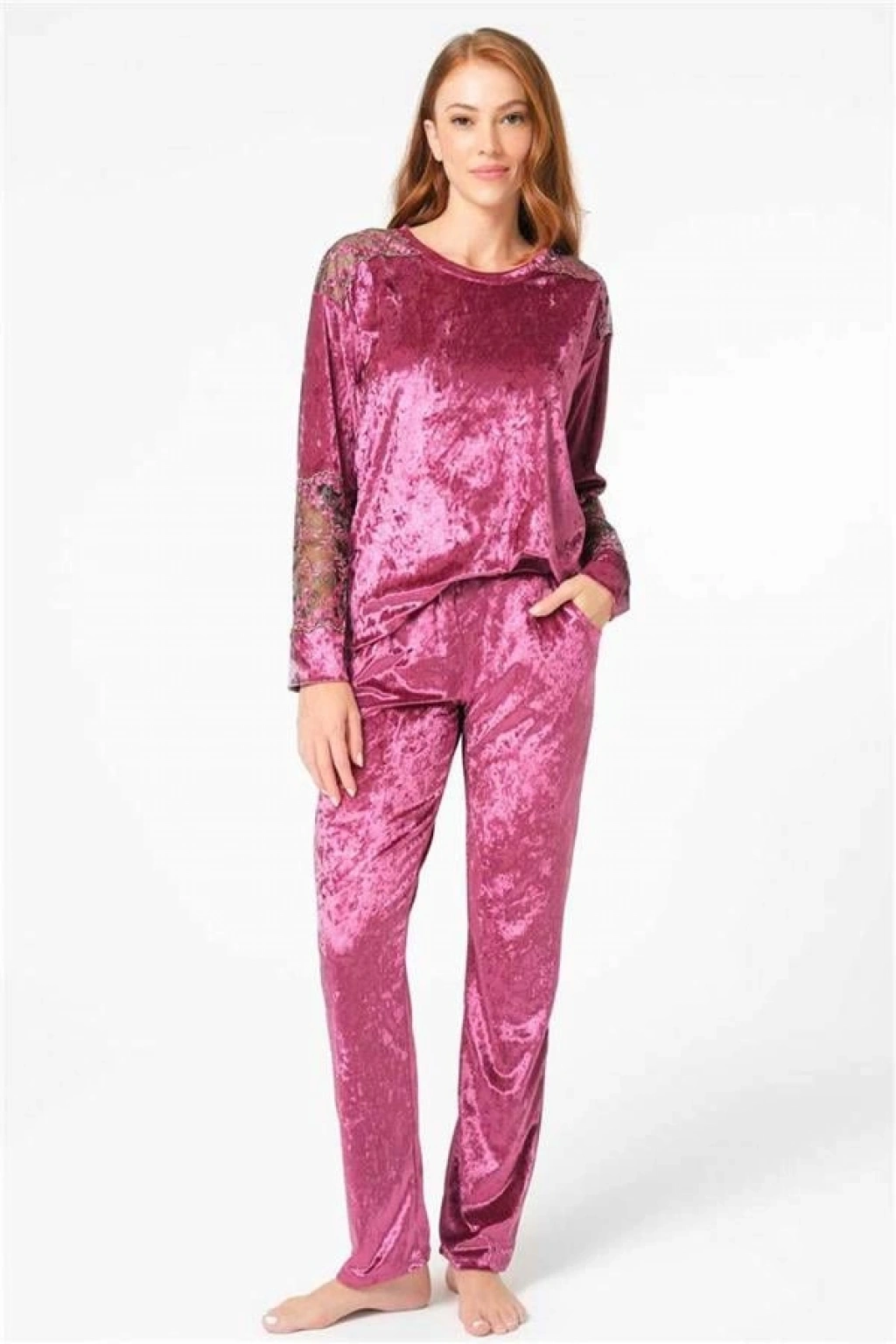 VipMarketim Anıl Uzun Kol Bisiklet Yaka Kadife Jakar Desenli Kışlık Örme Normal Bel Dantel Detaylı Pijama Takımı (Kod:9862)