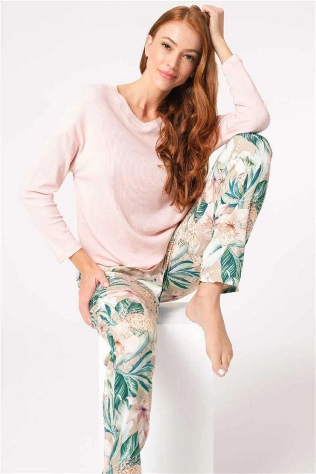 VipMarketim Anıl Uzun Kol V Yaka Viskon Çiçek Desenli Kışlık Örme Normal Bel Pijama Takımı (Kod:9854)