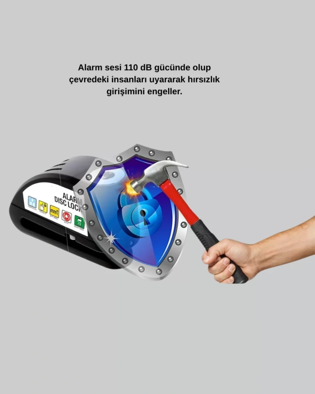 Bu titreşim algılamalı 110 dB alarmlı disk fren kilidi, motosiklet ve bisiklet sahipleri için profesyonel bir güvenlik çözümüdür. Özellikle dış mekânda park edilen araçlar için tam koruma sağlar. Üzerindeki akıllı şok sensörü, kilit sarsıldığında veya kurcalandığında devreye girer ve yüksek sesli alarm çalar. 110 desibellik alarm gücü sayesinde çevredeki insanlar hemen dikkat kesilir, hırsızlık girişimleri daha başlamadan engellenir.Kilit, sertleştirilmiş çelik 14 mm kilitleme pimi ile güvenlik standartlarının üzerinde bir dayanıklılık sunar. Hem profesyonel müdahalelere hem kaba kuvvete karşı yüksek direnç gösterir. Alaşım metal gövdesi darbeye dayanıklıdır ve uzun yıllar formunu korur. Ayrıca su geçirmez yapısı sayesinde yağmur, çamur ve nem gibi hava şartlarından etkilenmez.Disk kilidi, 7 mm kalınlığa sahip tüm fren diskleri ile uyumludur. Bu sayede motosiklet, scooter, bisiklet ve elektrikli motosikletlerde kullanılabilir. Harley, Yamaha, Honda, KTM, Suzuki ve Kawasaki gibi birçok markada sorunsuz çalışır. Taşınabilir kompakt tasarımı ile seyahatlerde veya günlük kullanımda her zaman yanınızda kolayca bulundurabilirsiniz.Kullanımı oldukça pratiktir. Kilidi fren diskine takıp bastığınız anda otomatik olarak devreye girer. Titreşim algılandığında önce uyarı sesi verir; hareket devam ediyorsa güçlü alarm çalmaya başlar. Bu akıllı çalışma prensibi gereksiz alarm çalmasını engeller ve yanlış tetiklenmeleri minimuma indirir.Paket içinde kullanım kolaylığı sağlayan 1,5 metre alarm kablosu, 2 adet anahtar, alyan anahtar ve saklama çantası yer alır. Alarm kablosu, sürüşe başlamadan önce kilidi çıkarmayı hatırlatması için oldukça kullanışlıdır.Bu alarmlı disk fren kilidi; güçlü alarmı, sağlam çelik gövdesi, hava koşullarına dayanıklı yapısı ve geniş araç uyumluluğuyla motosiklet veya bisikletinizi korumanın en etkili yollarından biridir.
