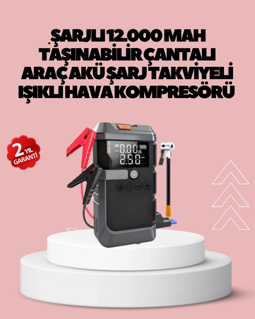 Çok fonksiyonlu yapısıyla dikkat çeken bu taşınabilir araç destek ünitesi, kullanıcıların yolculuk sırasında ihtiyaç duyabileceği tüm temel çözümleri bir araya getirir. Akü takviye özelliği, araç aküsünün zayıfladığı veya tamamen boşaldığı durumlarda hızlı bir başlangıç desteği sunarak zaman kaybını önler. Güçlü batarya kapasitesi, birden fazla kullanım senaryosunda istikrarlı performans sağlar ve acil durumlarda güvenilir bir yardımcı olur.Hava kompresörü fonksiyonu, düzenli lastik bakımı yapmak isteyen kullanıcılar için büyük kolaylık sağlar. Dijital ölçüm sistemi, lastik basıncını hassas şekilde takip etmeye imkân tanırken, otomatik kapanma özelliği aşırı basınç riskini ortadan kaldırır. Bu sayede kullanıcılar hem güvenli hem de doğru bir şişirme işlemi gerçekleştirebilir. Powerbank özelliği ise günümüzün vazgeçilmezi olan mobil cihazların şarj ihtiyacını karşılar ve uzun yolculuklarda ekstra konfor sunar.LED aydınlatma sistemi, özellikle gece yolculuklarında ve acil durumlarda fark yaratır. Güçlü ışık seviyesi sayesinde karanlık ortamlarda net görüş sağlar ve güvenliği artırır. Kompakt ve taşınabilir tasarımı, cihazın araçta veya çantada rahatça taşınmasına olanak tanır. Dayanıklı yapısı ve koruyucu taşıma çantası, ürünü uzun süreli kullanım için ideal hale getirir. Günlük sürüşlerden kamp ve outdoor aktivitelerine kadar geniş bir kullanım yelpazesi sunan bu ürün, sürücüler için pratik ve güvenilir bir yol arkadaşıdır.
