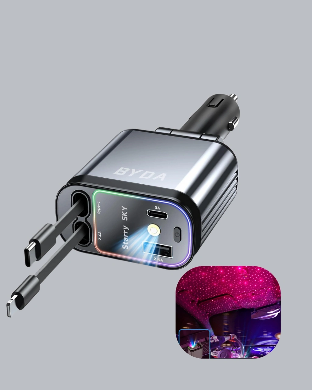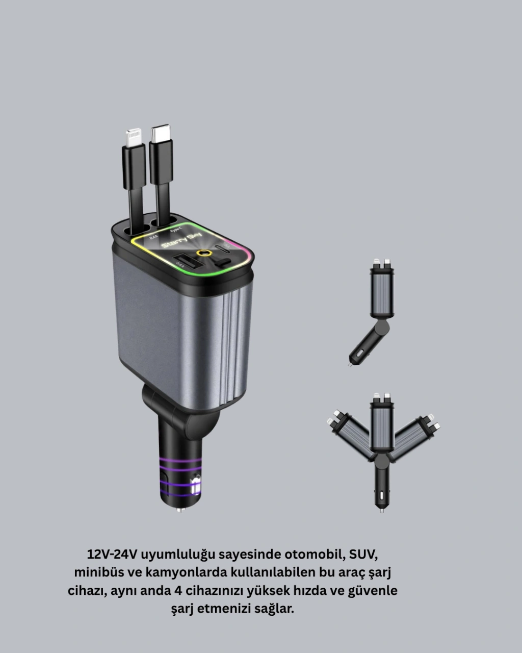 Seyahatlerinizde enerji sorunu yaşamayın! Araç Şarj Adaptörü 66W PD QC Hızlı Şarjlı ve Çekilebilir Kablolu, güçlü teknik donanımıyla araç içi şarj deneyimini üst seviyeye taşır.66W yüksek çıkış gücü, aynı anda dört farklı cihazı hızlı ve güvenli bir şekilde şarj etmenizi sağlar. Telefon, tablet, kulaklık, akıllı saat veya diğer USB cihazlarınız için ideal bir çözümdür.PD (Power Delivery) ve QC (Quick Charge) desteği, şarj süresini ciddi şekilde kısaltır. Akıllı akım dengeleme sistemi, cihazınızın pil ömrünü koruyarak aşırı ısınma, voltaj dalgalanması ve kısa devre risklerini ortadan kaldırır.Kompakt tasarımı ve çekilebilir kablo mekanizması, aracınızdaki kablo karmaşasını giderir. 80 cm’ye kadar uzayabilen kablo uzunluğu, sürüş sırasında esneklik sağlar.180° ayarlanabilir döner başlık, aracınızın priz konumuna göre rahat kullanım sunar.Gece kullanımı için entegre LED atmosfer ışığı, hem şık bir görünüm hem de konforlu bir deneyim sağlar.12V-24V araç uyumluluğu ile otomobil, SUV, minibüs ve kamyonlarda kullanılabilir.Araç Şarj Adaptörü 66W PD QC Hızlı Şarjlı ve Çekilebilir Kablolu, modern sürücüler için güvenilir, güçlü ve zarif bir enerji çözümüdür.