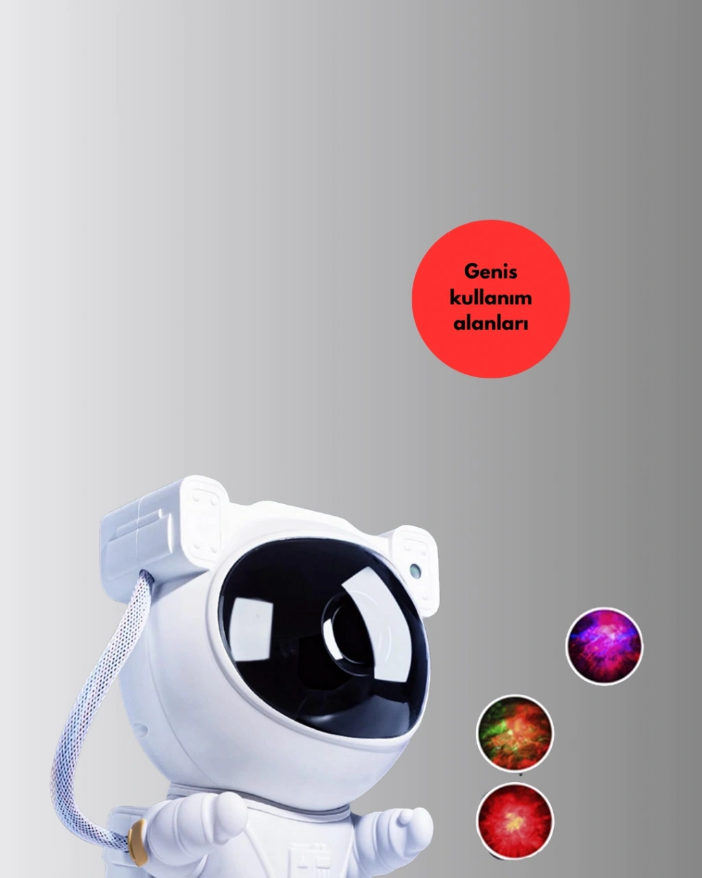 Bu modern projektör, astronot şeklindeki hareketli baş kısmı sayesinde ışığın yönünü kolayca ayarlamanıza olanak tanır.Kolları mafsallı, tabanı çıkarılabilir tasarımıyla esnek kullanım imkânı sunar. Yatak odası, oturma odası, oyun odası veya film geceleri için harika bir ambiyans yaratır.Renkli ışık geçişleriyle romantik, huzurlu veya eğlenceli atmosferler oluşturabilir; parti, doğum günü ve kutlamalarda fark yaratabilirsiniz.