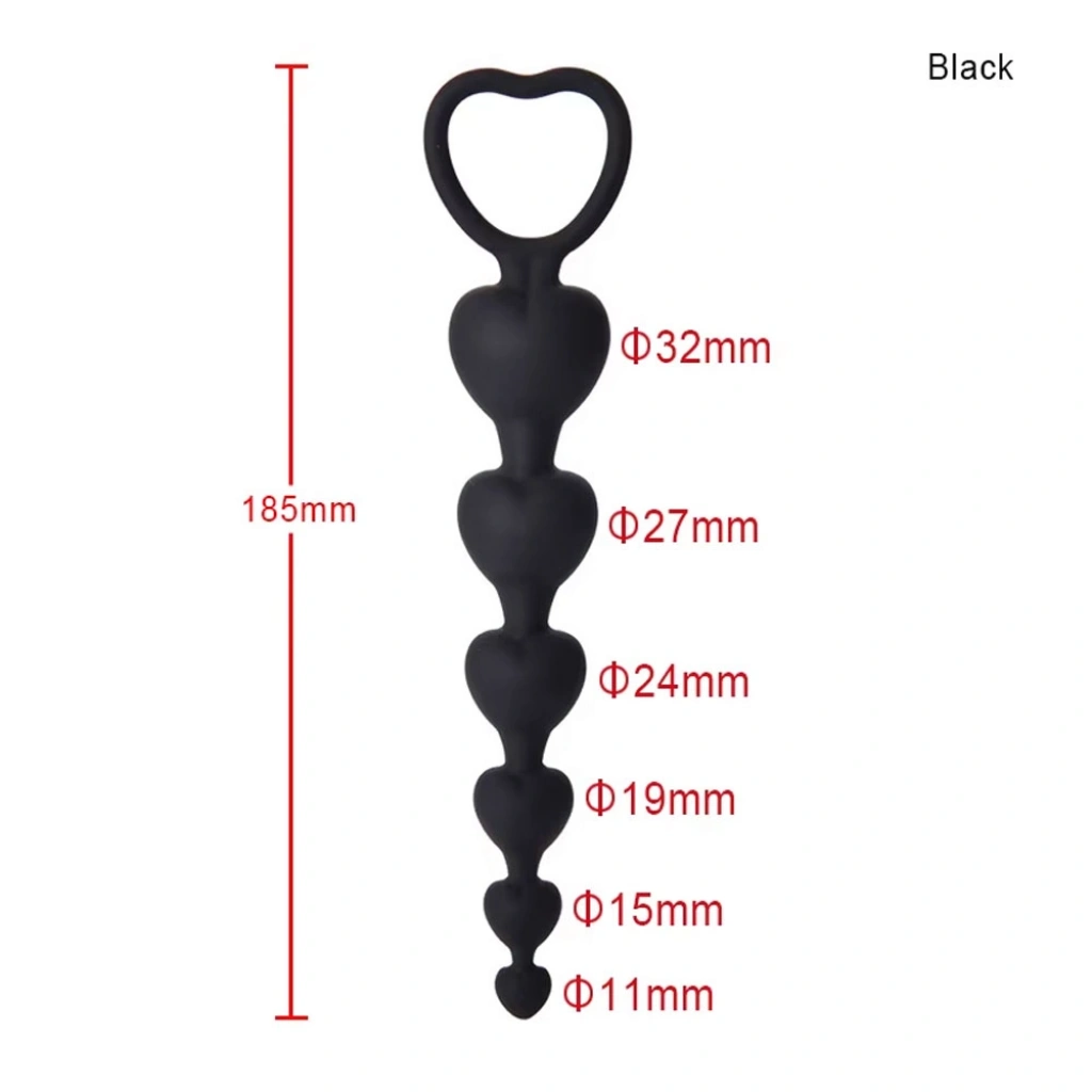 Küçükten büyüye giden çaplarda kalp şeklinde 5 boğumlu bu anal tıkaç (plug) pürüzsüz yüzeye sahiptir. Sudan etkilenmez kolaylıkla yıkanabilir. Yaklaşık 19 cm uzunluğundadır. Ürün çapları resimde belirtilmiştir. Bükülebilir esnek yapıdadır. Tutma halkası sayesinde kolay kullanım ve konfor sağlar.