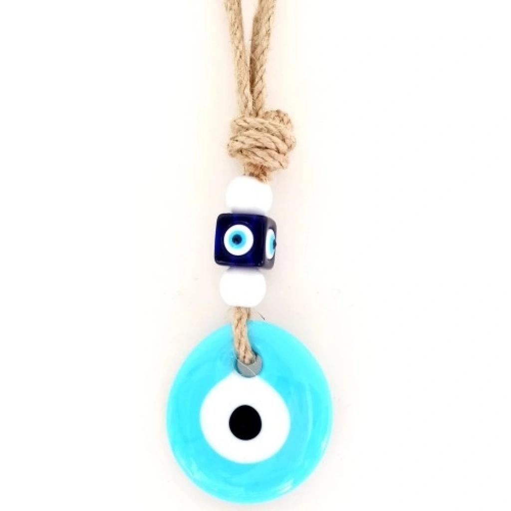 Renk: Bebek mavisi Nazar boncuğu çapı: 4,5 cm Toplam uzunluk: 21 cm (ip dahil) Malzeme ve işçilik: 1. kalite Dekoratif ve anlamlı tasarım Hediye olarak ideal mini nazarlık modeli