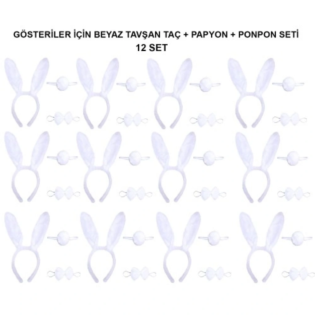 Beyaz Tavşan Kostüm Seti | 12’li Paket (Taç + Papyon + Kuyruk)Sınıf etkinlikleri, kreş gösterileri ve büyük organizasyonlar için en pratik ve şirin çözüm! 12’li Beyaz Tavşan Kostüm Seti, toplu sipariş avantajıyla tüm çocukları aynı anda sevimli birer tavşana dönüştürür. Yumuşak peluş dokusu ve esnek yapısı sayesinde minikler gösteri boyunca hem konforlu hissedecek hem de sahnede ışıldayacaklar.Paket İçeriği: 12 Set (Toplam 36 Parça)Her bir set, karakteri tamamlayan 3 temel parçadan oluşur (Paket içerisinde bu setten 12 adet bulunur):Şekil Verilebilir Kulaklı Taç: Peluş kaplamalı, kafa yapısını sıkmayan esnek taç. Kulakların içindeki teller sayesinde kulaklara dik veya kıvrık şekil verilebilir.Pratik Papyon: Lastikli yapısı sayesinde her boyun ölçüsüne uyum sağlayan, beyaz saten/peluş detaylı şık papyon.Ponpon Kuyruk: Elastik bandı sayesinde pantolon, etek veya tayt üzerine saniyeler içinde takılabilen ikonik tavşan kuyruğu.Öne Çıkan AvantajlarEkonomik 12’li Paket: Okul gösterileri, tiyatro grupları ve toplu doğum günü partileri için bütçe dostu ve eksiksiz bir çözümdür.Esnek ve Güvenli Tasarım: Çocukların hassas tenine zarar vermeyecek yumuşak malzemelerden üretilmiştir. Taç ve lastikler hareket özgürlüğünü kısıtlamaz.Kulaklara Şekil Verme Özelliği: İç tel yapısı sayesinde kulakları dilediğiniz açıda sabitleyerek farklı ifadeler yaratabilirsiniz.Kolay Kullanım: Karmaşık kostümlerin aksine, günlük kıyafetlerin üzerine hızla takılarak anında kostüm bütünlüğü sağlar.Kullanım Alanları23 Nisan ve Okul Gösterileri: Sahne performanslarında sınıf boyu uyumlu bir görünüm yakalamak için.Temalı Doğum Günü Partileri: "Alice Harikalar Diyarında" veya "Tavşan" temalı partilerde küçük misafirlere hediye olarak dağıtılabilir.Tiyatro ve Drama Çalışmaları: Çocukların canlandırma yeteneklerini artıran, hafif ve dikkat dağıtmayan aksesuar seti.Yıl Sonu Müsameleri: Kreş ve anaokulu etkinliklerinin vazgeçilmez kostüm parçası.Teknik Özellikler TablosuÖzellikDetayPaket İçeriği12 Adet Taç + 12 Adet Papyon + 12 Adet KuyrukRenkBeyaz (Klasik Tavşan Teması)MateryalPeluş, Tekstil ve Şekil Verilebilir TelBedenÇocuk Boy (Esnek Standart)UyumErkek ve Kız Çocuklar İçin Uygundur