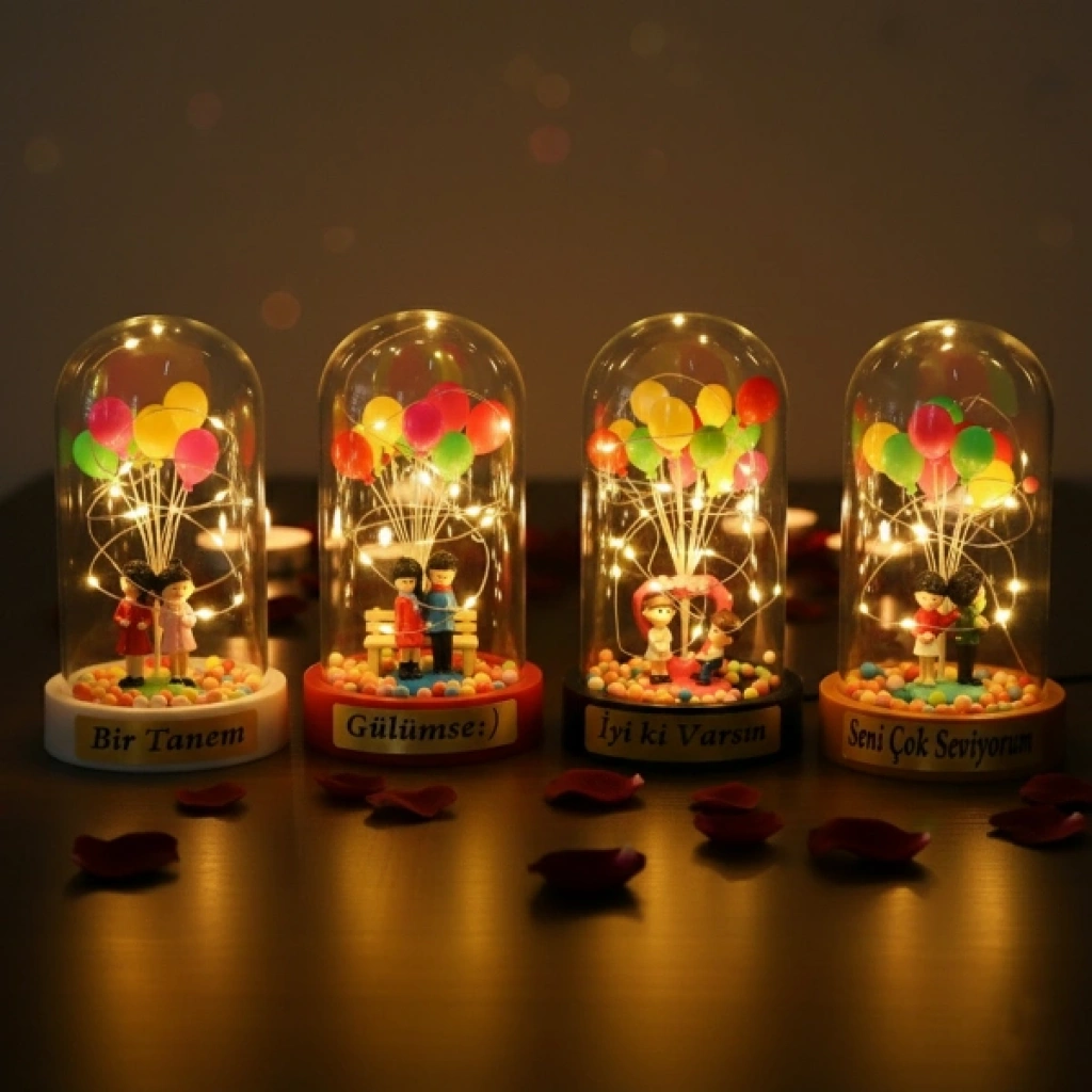 Biblolu balonlu ledli fanus, eğlenceli figürleri ve sıcak ışık etkisiyle yaşam alanlarına neşeli ve romantik bir ambiyans kazandıran dekoratif bir üründür. Şeffaf fanus içerisinde yer alan balonlu biblo figürleri, LED ışıklarla birlikte hareketli ve dikkat çekici bir görünüm sunar. Sahip olduğu gün ışığı LED aydınlatma sayesinde yumuşak ve huzur verici bir ışık yayarak masa, komodin ve raf üzerinde estetik bir atmosfer oluşturur. Kompakt ölçüsüyle yer kaplamadan kullanılabilen bu model, özel günlerde dekoratif hediyelik fanus arayanlar için ideal bir tercihtir. Model seçimi yapılamayan ürün, görsellerde yer alan tasarımlardan biri olacak şekilde karışık model gönderimi yapılmaktadır. Ürün Teknik Özellikleri Özellik Açıklama Ürün Adı Biblolu Balonlu Ledli Fanus Boyut 10 x 18 cm Aydınlatma Gün ışığı LED Tasarım Şeffaf fanus, balonlu biblo figürleri Model Karışık gönderilir Kullanım Alanı Masa, komodin, raf Kullanım Amacı Dekoratif ve hediyelik Paket İçeriği1 adet biblolu balonlu ledli fanus
