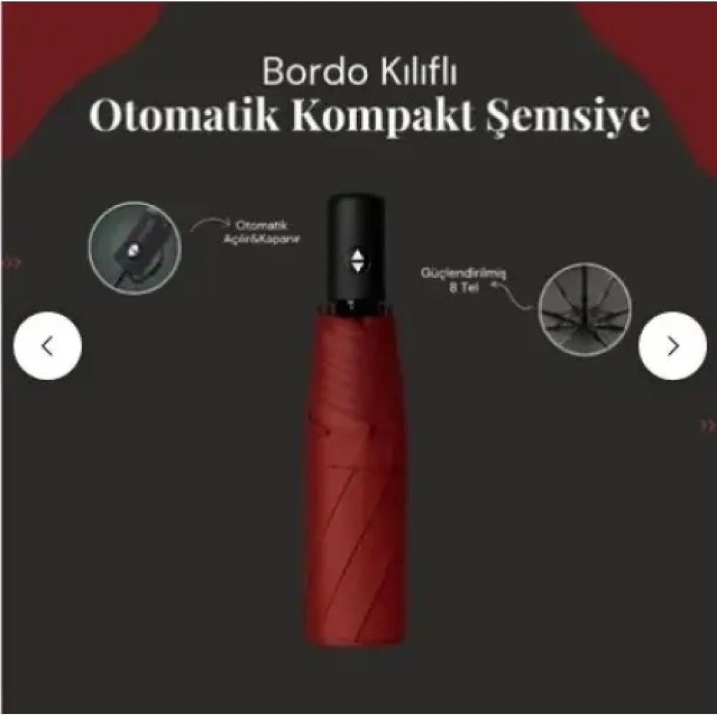 BORDO KILIFLI OTOMATİK KOMPAKT ŞEMSİYEBordo kılıflı otomatik kompakt şemsiye, hem şıklığı hem de fonksiyonelliği bir araya getiren tasarımıyla yağmurlu günlerde en güvenilir yol arkadaşınızdır. Tek tuşla açılma özelliği sayesinde ani bastıran yağışlarda size hız kazandırırken, dayanıklı gövde yapısı ve su itici kumaşıyla tam koruma sağlar. Kompakt boyutları sayesinde çantanızda, ofis çekmecenizde veya aracınızda yer kaplamadan her an elinizin altında bulunur.Öne Çıkan ÖzelliklerTek Tuşla Otomatik Açılma: Pratik mekanizması sayesinde tek elle saniyeler içinde açılır; özellikle araçtan inerken veya eliniz doluyken büyük kolaylık sağlar.Geniş Koruma Alanı: 98x58 cm boyutlarındaki açık formu, sizi ve eşyalarınızı yağmurdan etkili bir şekilde koruyacak geniş bir siperlik alanı sunar.Kompakt ve Taşınabilir: Kapalı halde sadece 28x6 cm boyutlarına ulaşan yapısı, günlük çantalar ve sırt çantaları için mükemmel bir ergonomi sunar.Rüzgâra Dayanıklı 8 Telli Yapı: Güçlendirilmiş 8 adet çelik tel düzeneği, sert rüzgârlarda şemsiyenin formunu korumasını ve ters dönmelere karşı dirençli olmasını sağlar.Yüksek Kaliteli Su Geçirmez Kumaş: Sık dokumalı kumaş yapısı suyu üzerinde tutmaz, hızlı kuruma özelliği sayesinde kullanım sonrası konfor sunar.Ergonomik Sap Tasarımı: Uzun süreli kullanımlarda eli yormayan, kaymaz ve rahat tutuş sağlayan özel sap yapısı ile donatılmıştır.Kullanım AlanlarıGünlük Şehir Hayatı: İşe, okula veya alışverişe giderken çantanızda taşıyabileceğiniz hafif ve şık bir aksesuar.Seyahat ve Tatil: Valizde minimum yer kaplayan tasarımıyla gezi rotalarınızda beklenmedik hava değişimlerine karşı hazırlıklı olmanızı sağlar.Ofis ve İş Dünyası: Bordo rengin verdiği profesyonel ve klasik görünümle iş kıyafetlerinize mükemmel uyum sağlar.Teknik Özellikler TablosuÖzellikDetayÜrün TipiOtomatik Kompakt ŞemsiyeMekanizmaTek Tuşla Otomatik AçılırAçık Boyut98 cm (Genişlik) x 58 cm (Yükseklik)Kapalı Boyut28 cm x 6 cmTel Sayısı8 Telli Güçlendirilmiş GövdeKumaş TürüYüksek Yoğunluklu Su Geçirmez KumaşRenkŞık BordoPaket İçeriği1 Adet Bordo Şemsiye + 1 Adet Özel Kılıf