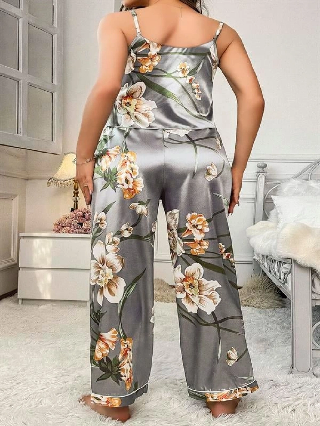 Yumuşak gri tonunun huzur verici etkisi, zarif çiçek desenleriyle buluşuyor. İnce askılı üst ve dökümlü pantolondan oluşan bu büyük beden takım; hafif kumaşı ve salaş kesimi sayesinde vücudu sarmadan rahatlık sunarken feminen bir görünüm kazandırıyor.