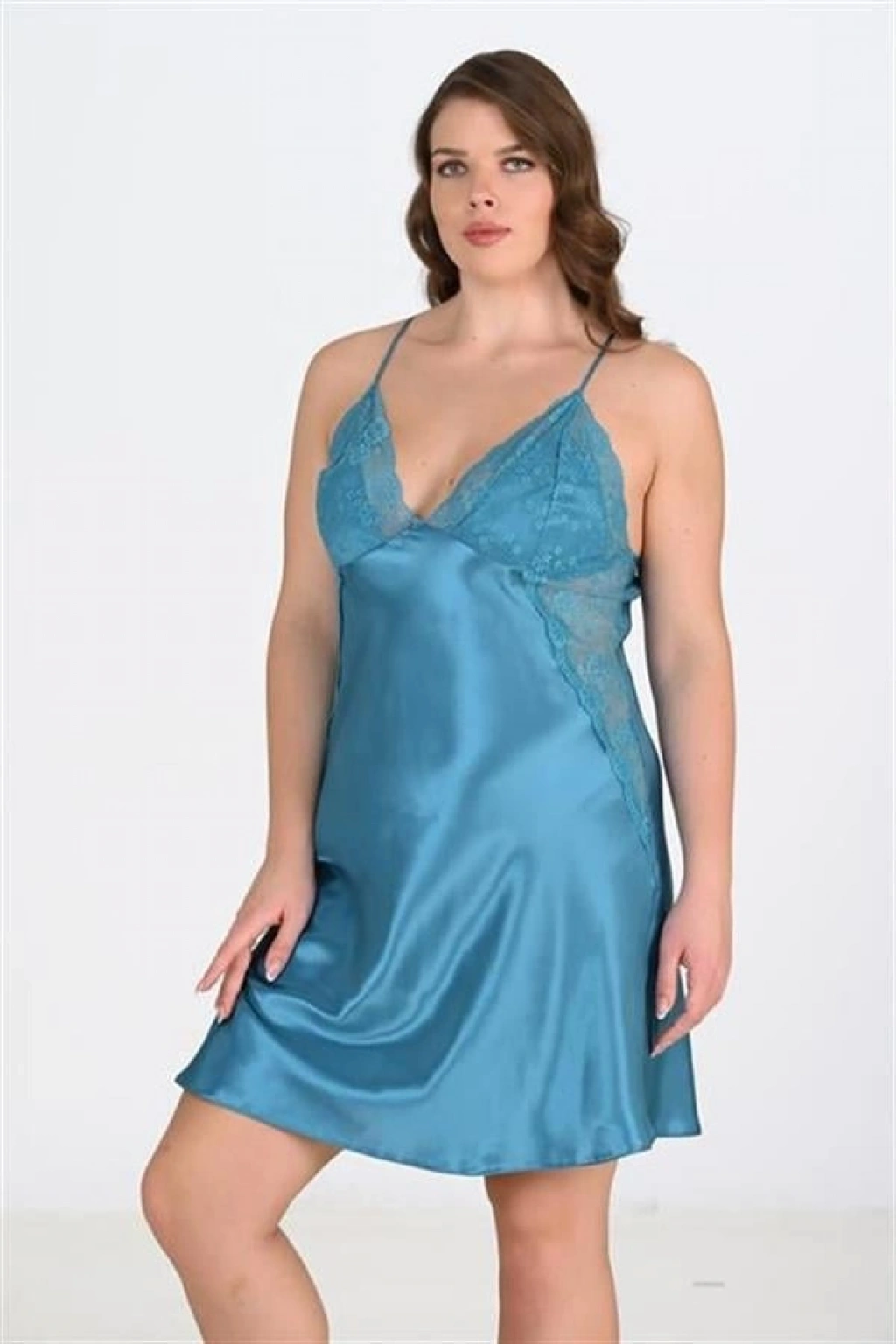VipMarketim Büyük Beden Dantel İşlemeli Petrol Mavisi Saten Gecelik
